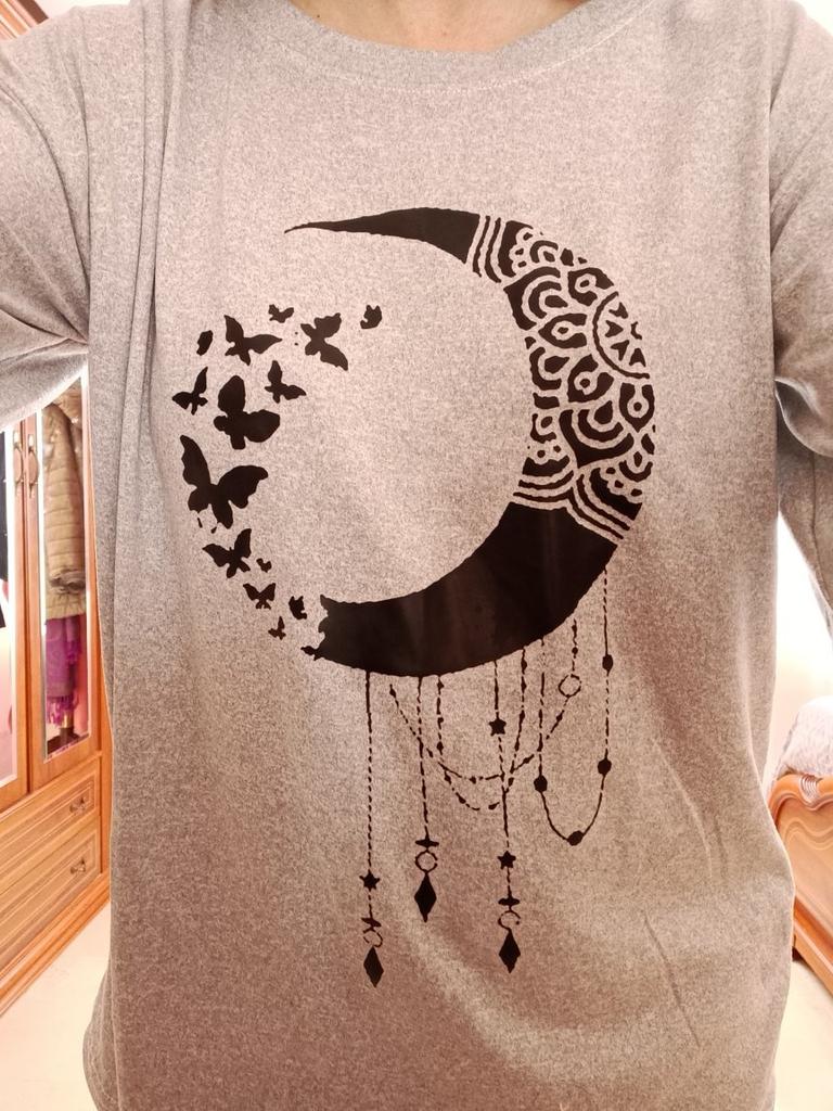 není to bavlna. Velikost M je moje velikost (Španělsko). Tato velikost M je trochu větší, ale nevadí. Látka je moc pěkná. Je to košile, která je široká, část složení je elastická, ale nepřiléhá k tělu. Kresba není malovaná, je jako samolepka . Jak jsem to viděl na obrázku, zdálo se, že je namalovaný a není tomu tak. Jednou jsem to vypral a pořád je dobrý.
