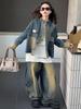 Vintage Distressed Denim Suit: Loose Shoulder Pad Jacket & Straight Pants Set.