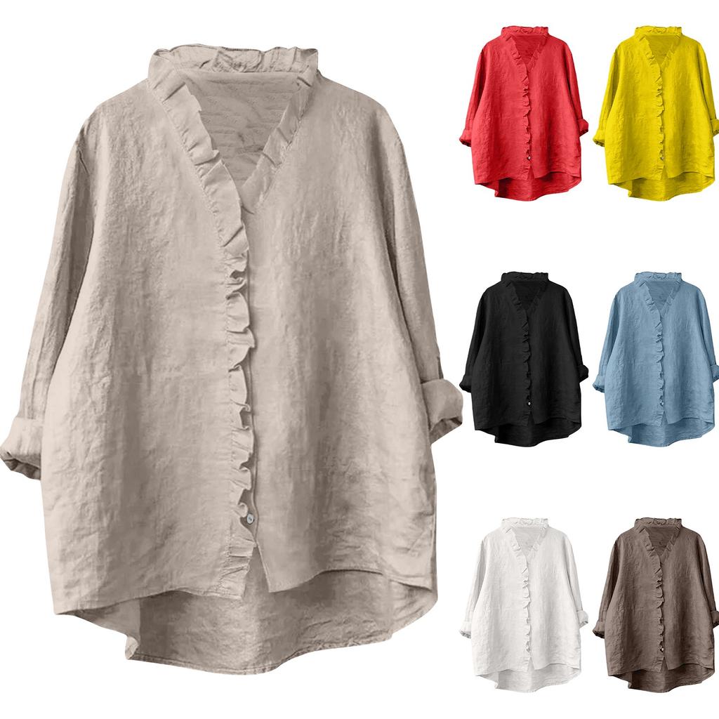 Dámský volný top s volánky, jednobarevný, se stojáčkem, s dlouhým rukávem, bavlněný a lněný