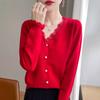 Red lace splicing sweater women's autumn and winter design waist knitted cardigan small short top
