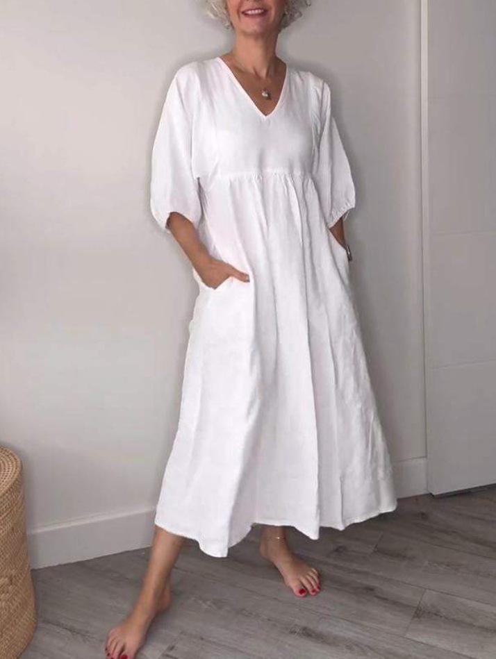 Zažijte bezstarostnou eleganci s těmito stylovými bavlněno-lněnými šaty s výstřihem do V, ideálními pro podzimní sezónu.. Navrženo pro moderní ženu, má lichotivý volánkový design a uvolněný střih, zajišťující pohodlí a styl.. Šaty mají praktické kapsy, ideální pro uložení vašich nezbytností.. Je vyroben ze směsi bavlny a lnu, poskytuje prodyšnost a měkký dotek, což z něj činí dokonalý doplněk vašeho ležérního šatníku.