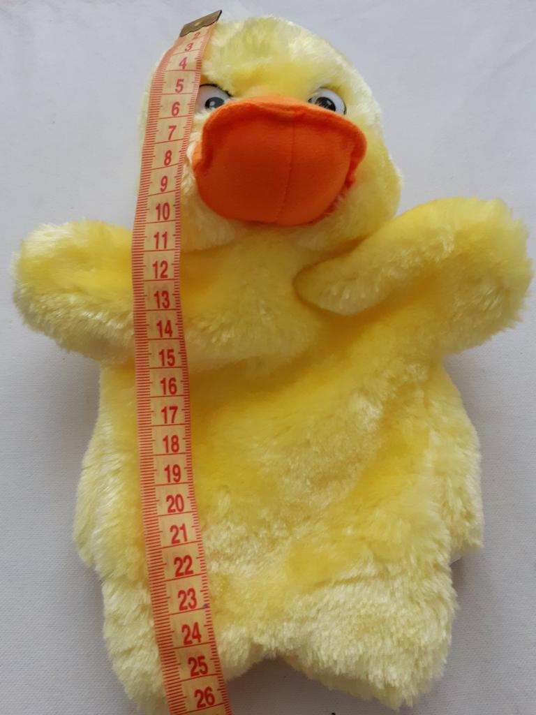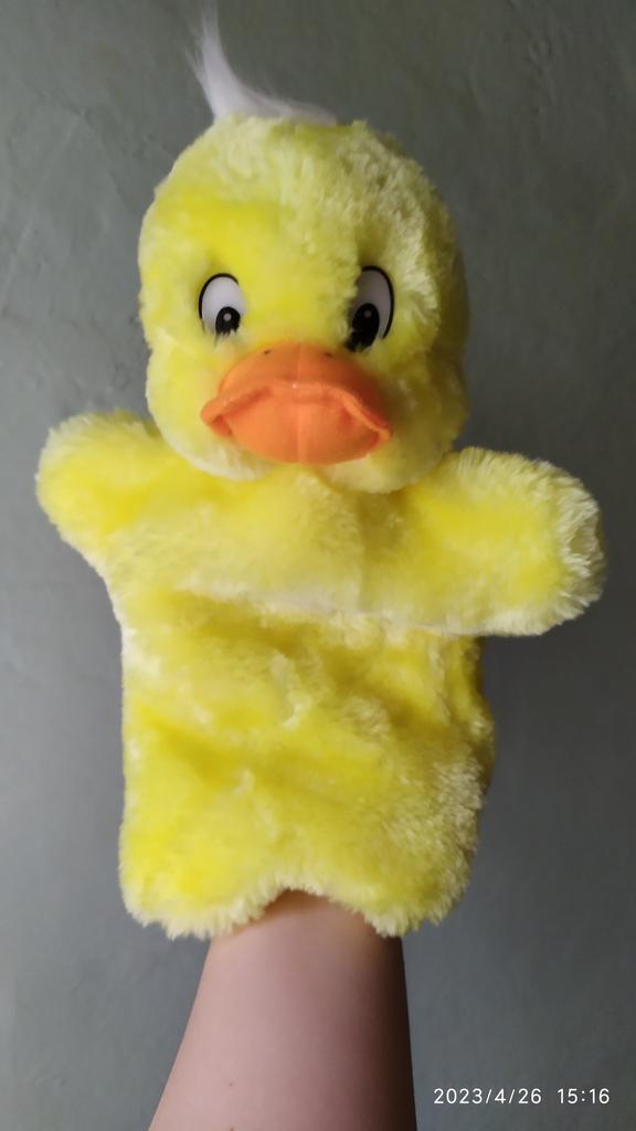 Ein gutes, niedliches, interessantes Spielzeug, aber sehr unbequem! Für eine erwachsene Hand ist es klein und zierlich, für ein Kind jedoch breit und unbequem. Der Entenkopf kann nicht auf den Finger gesteckt werden, da dies nicht durch den Schnitt vorgesehen ist, und fällt ständig um.