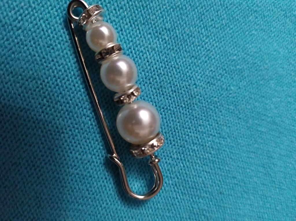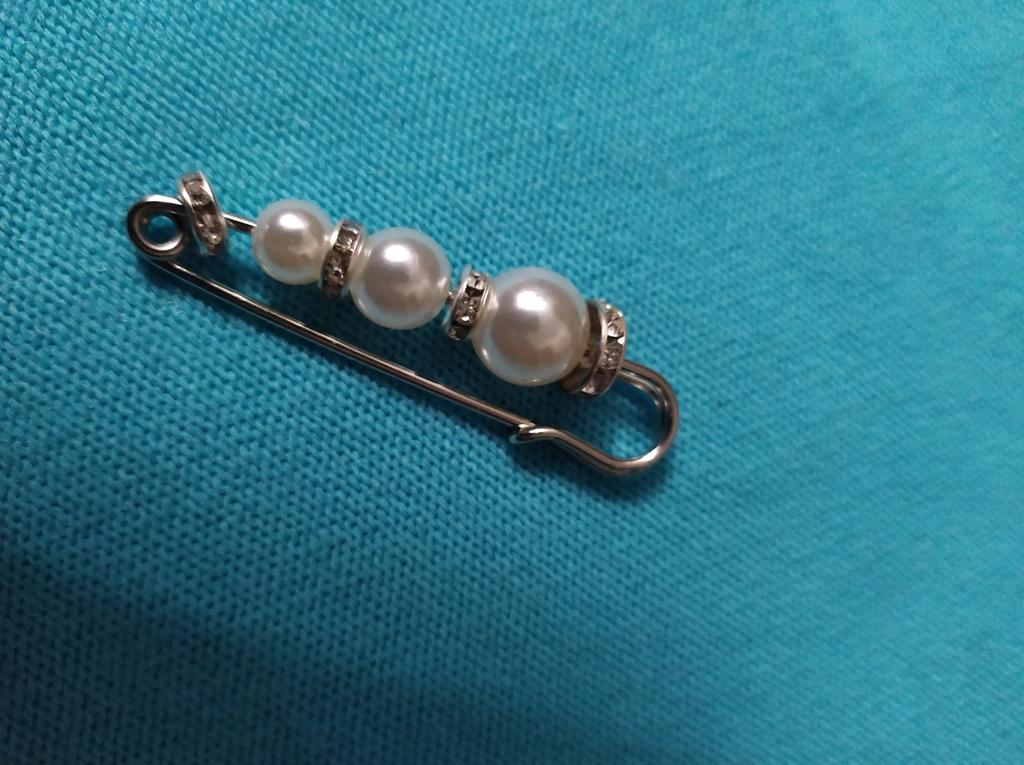Brosche - Englische Nadel mit drei weißen Perlen 5,6 cm lang gekauft für Punkte, sehr schön, einfach zu bedienen, glänzend. Zufrieden mit dem Kauf empfehle ich den Verkäufer. Die Bestellung kam schnell.💎💎💎👍👍👍