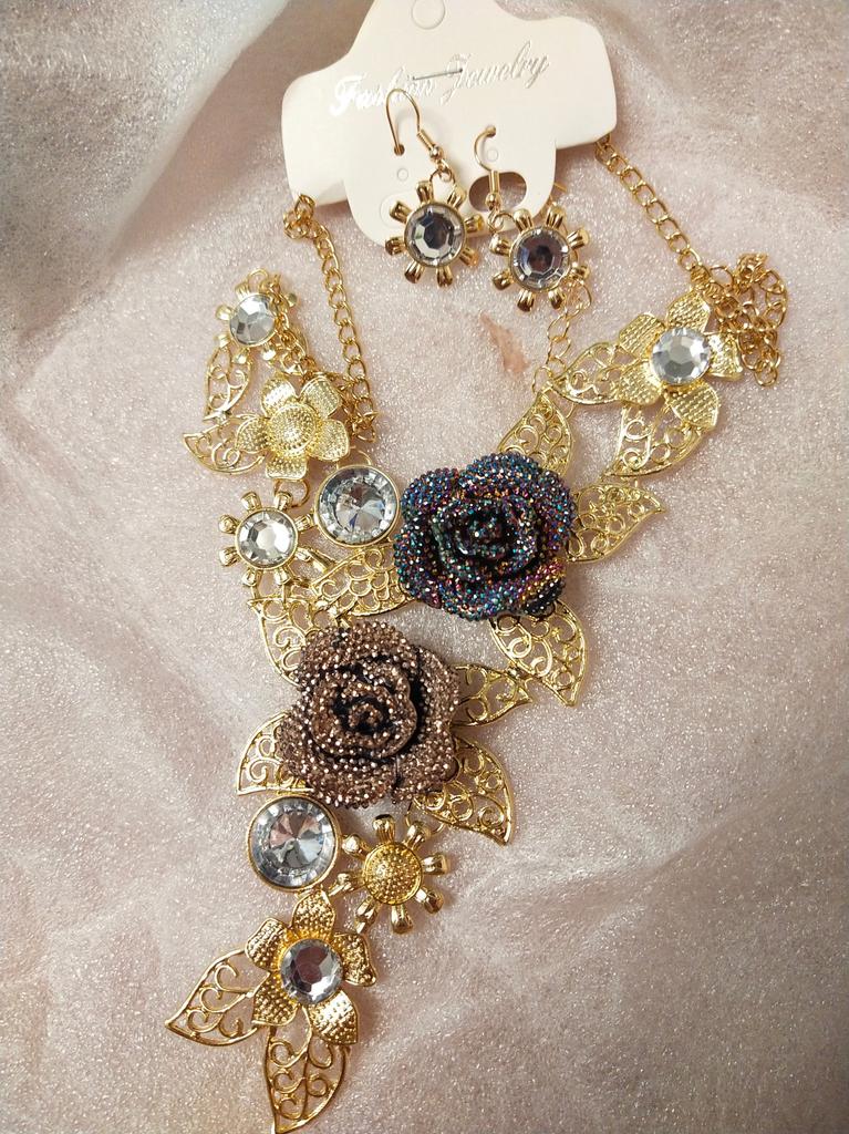 Diamonding Schmuck Frauen Kristallstein eingelegte hohle Blatt-Blumen-Anhänger-Ohrring-Halsketten-Set