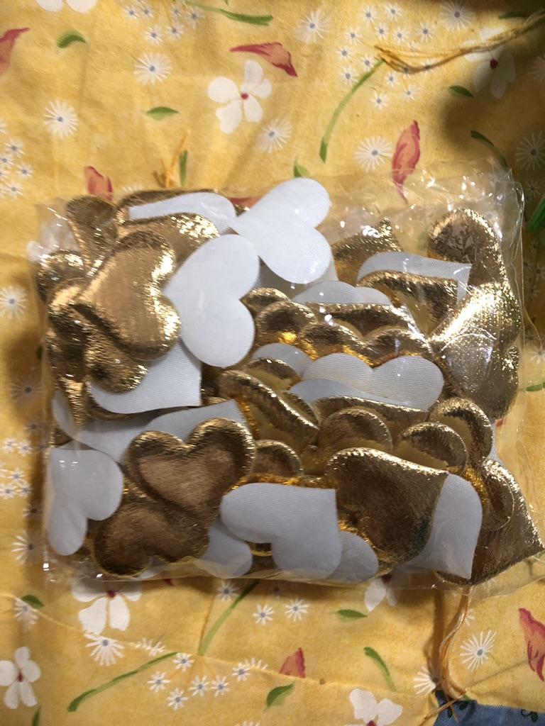 Ca. 100 goldene Stoff Herzen. Sie sehen sehr schön, es sind aber ein paar kaputte darunter. Schade. 🙄🦋