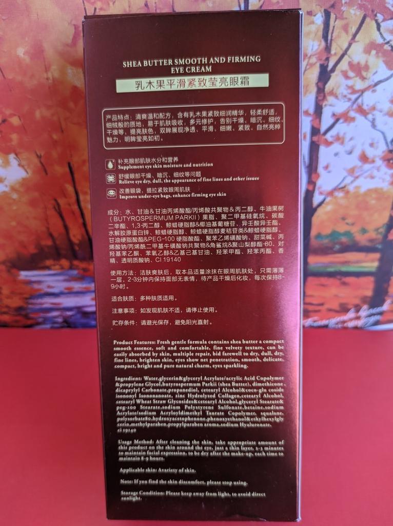 Dass Sheabutter gut für die Augenpartie ist, wissen wir alle Als ich eine Augenpflegecreme mit Sheabutter sah, beschloss ich, sie auszuprobieren Ich habe das Produkt erhalten und es befindet sich noch in der Testphase Aber soweit ich das sagen kann, ist die Feuchtigkeitspflege ausgezeichnet Bei den Spezifikationen steht geschrieben, dass es sich hervorragend für Schwellungen um die Augen und Augenringe eignet Nach einer Weile werde ich den Kommentar bearbeiten und Ihnen mehr darüber erzählen Aber anfangs gefällt es mir Der Versand 🚚 war schnell Die Verpackung war ausgezeichnet, das Produkt kam ohne Schäden oder Mängel an 💯