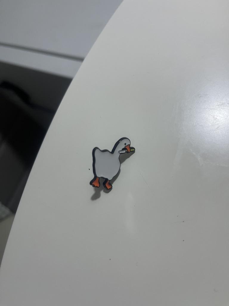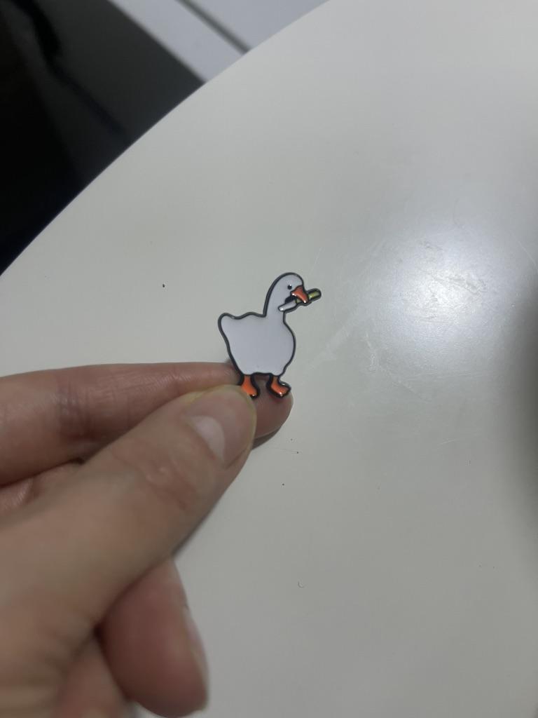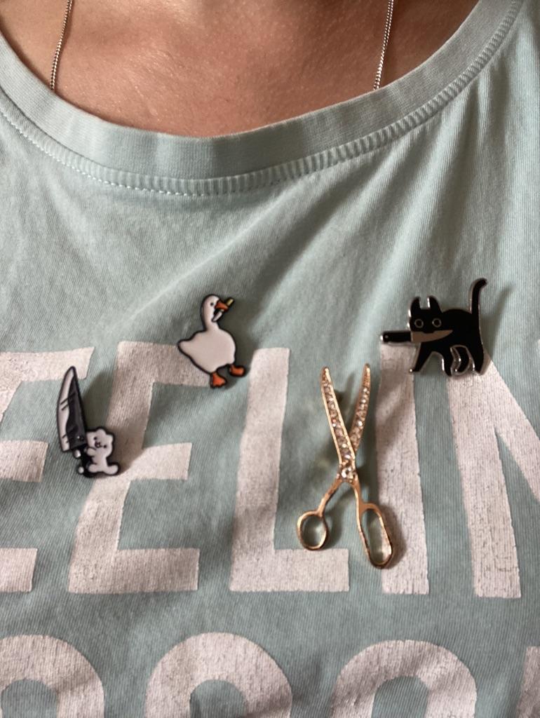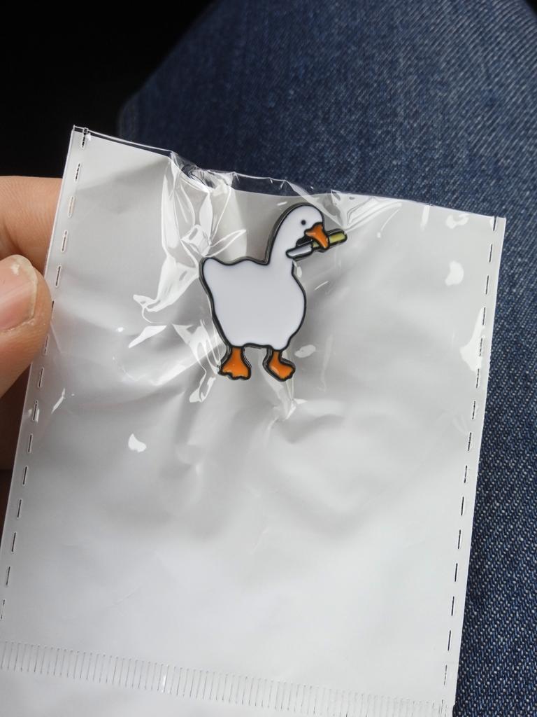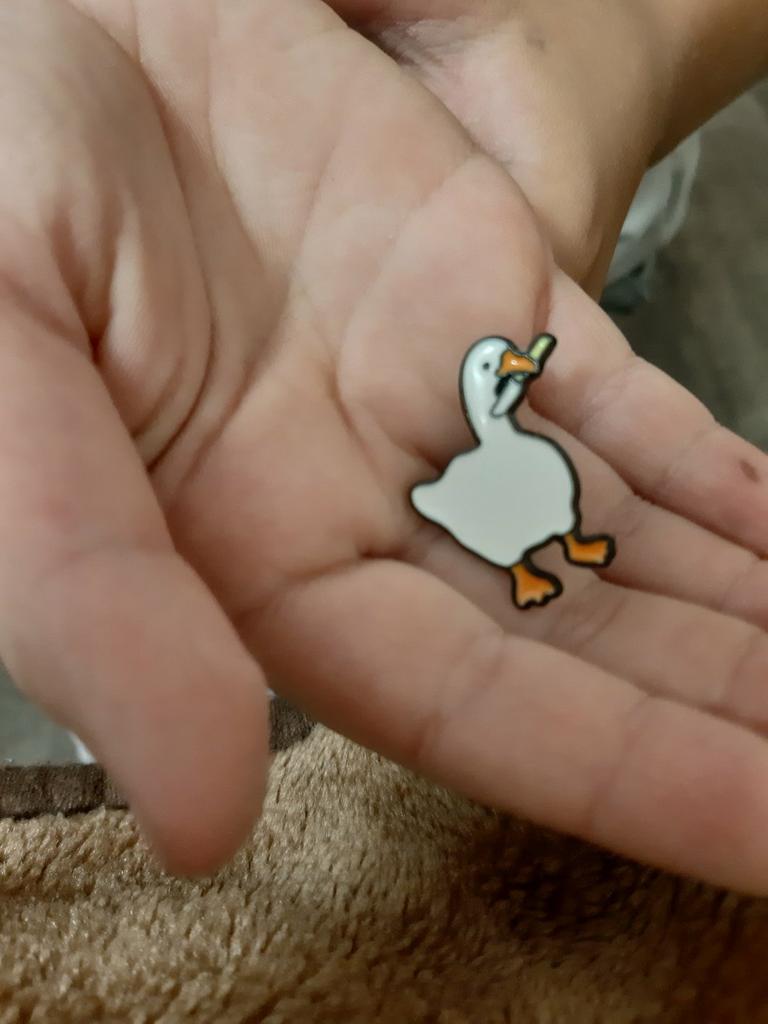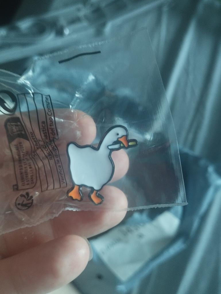 Ich habe vorhin eine Gans bestellt, aber meine jüngere Schwester hat sie weggenommen. Ich mag alles. Ich habe eine kleine und süße Anstecknadel an meiner Jeans.