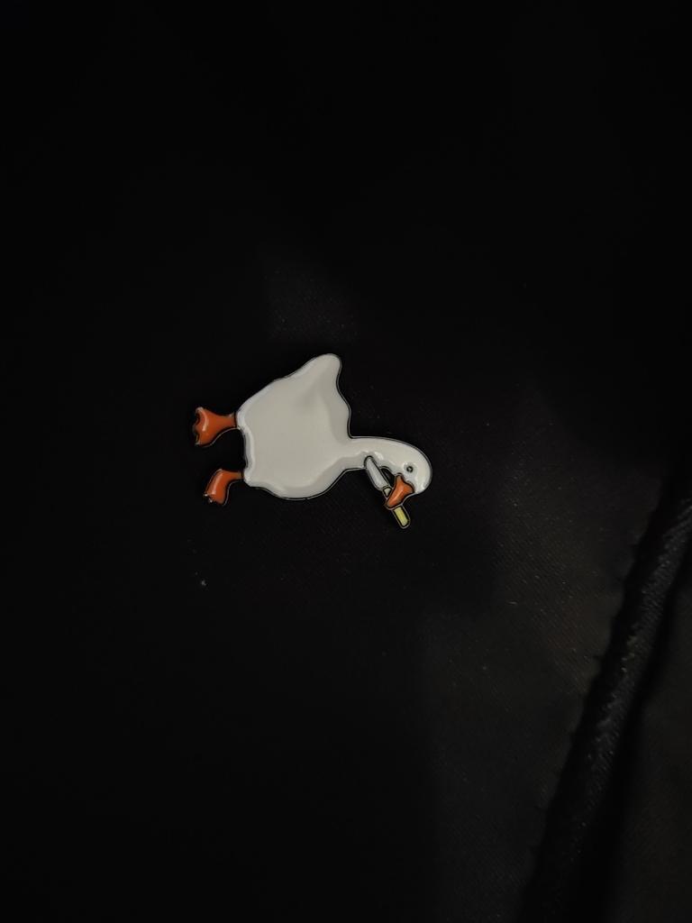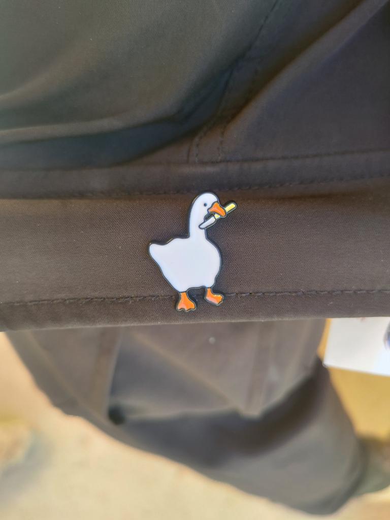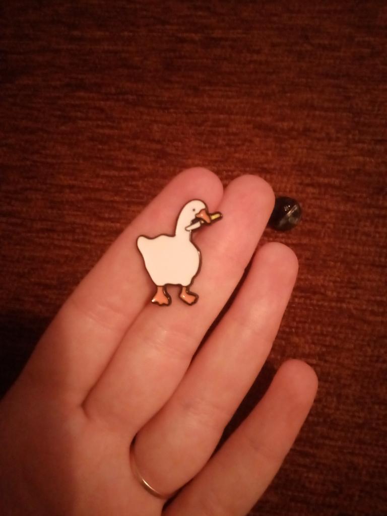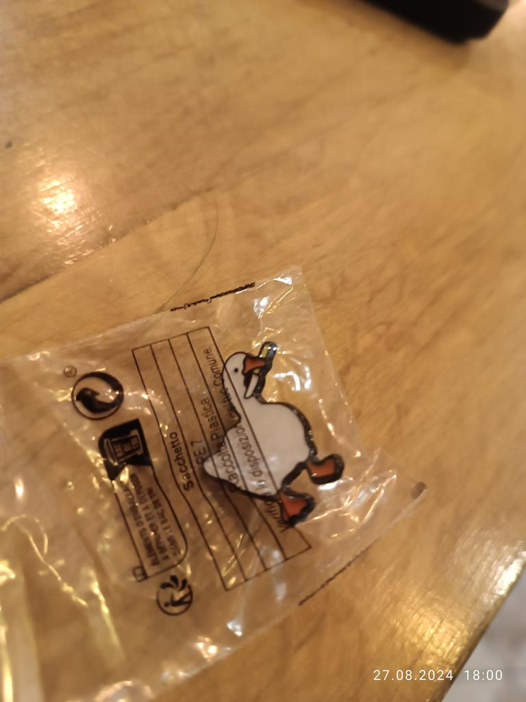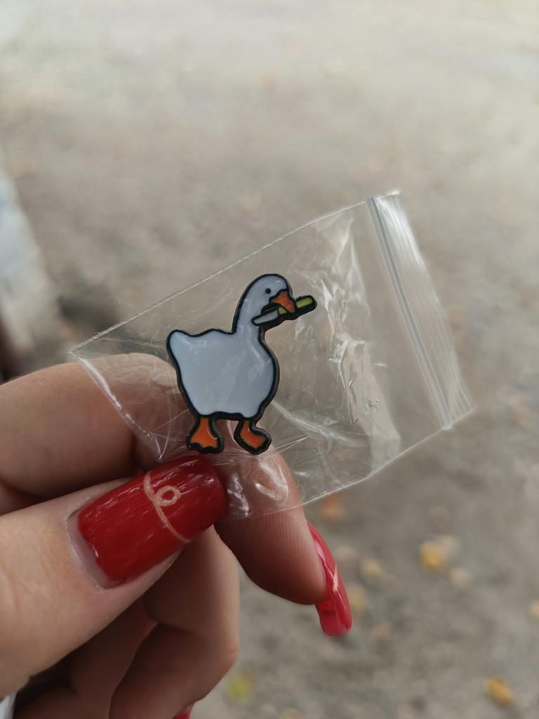 Ich habe vorhin eine Gans bestellt, aber meine jüngere Schwester hat sie weggenommen. Ich mag alles. Ich habe eine kleine und süße Anstecknadel an meiner Jeans.
