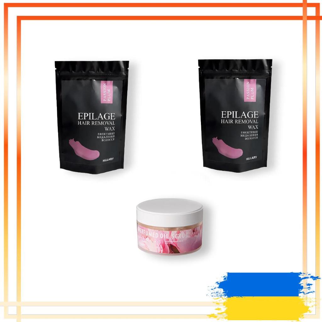 В набор входит:: Гранулы для эпиляции Hillary Epilage Passion Plum, 200 г (2 упаковки) Скраб для тела парфюмированный Hillary Perfumed Oil Scrub Flowers, 200 г.