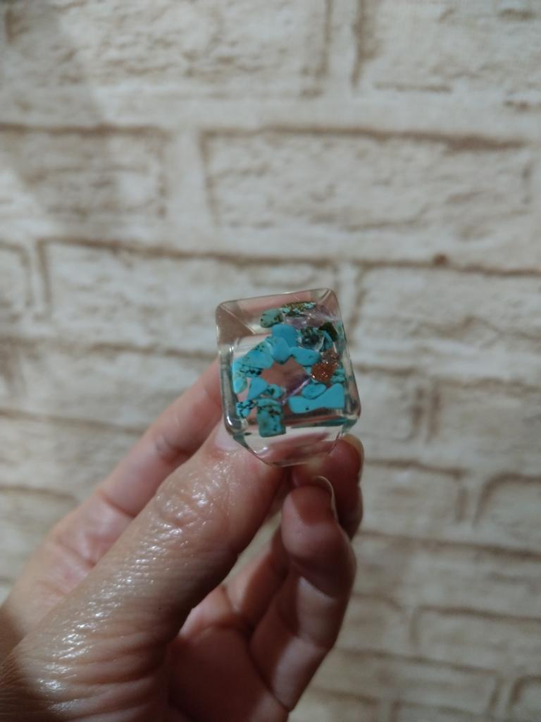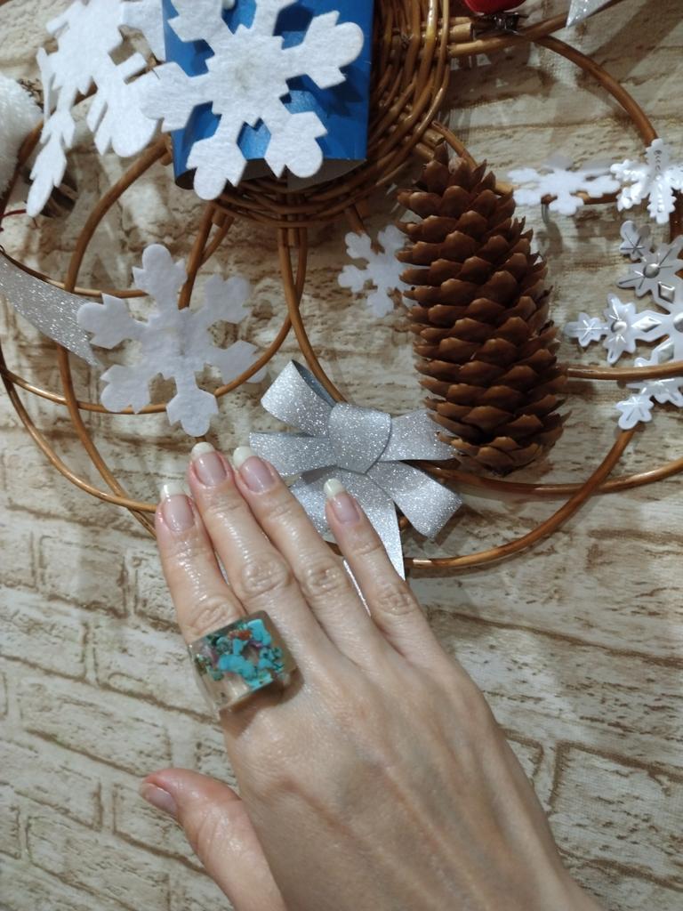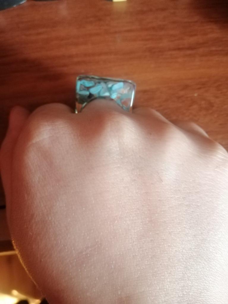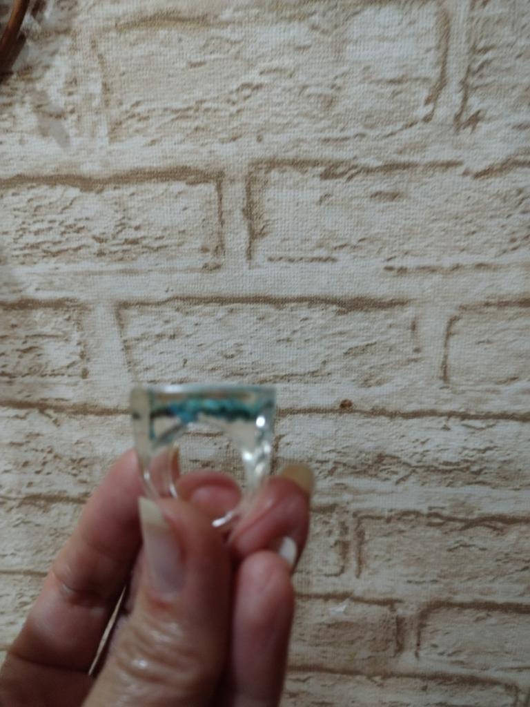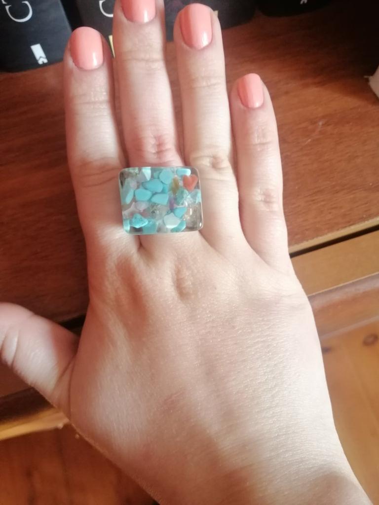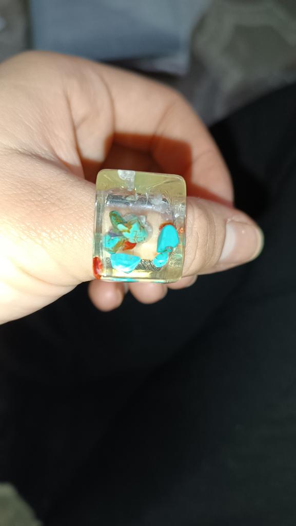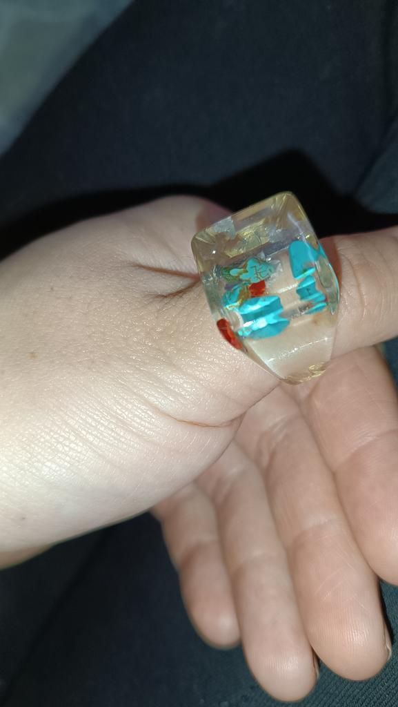 Ring aus Epoxidharz, innen blaue Steine. Einen Stern Abzug, da der Ring anders als auf dem Foto ist. Der Verkäufer hat diesen Ring bunter und besser. Es gibt keine Blasen oder Risse, der Ring ist gleichmäßig und massiv.