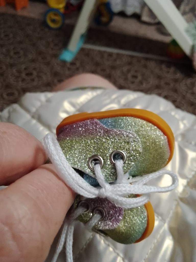 Schöne Schuhe, nur Kleber ist auf einer Seite sichtbar. Passend zu Paula.