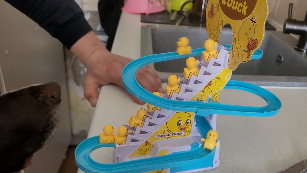 Lustiges, verspieltes Enten-Rennset, elektrisches Enten-Kletter-Treppenbahn-Spielzeug, Rhabarber-Ente mit blinkenden Lichtern und Musik, niedliches Badespielzeug für Kinder