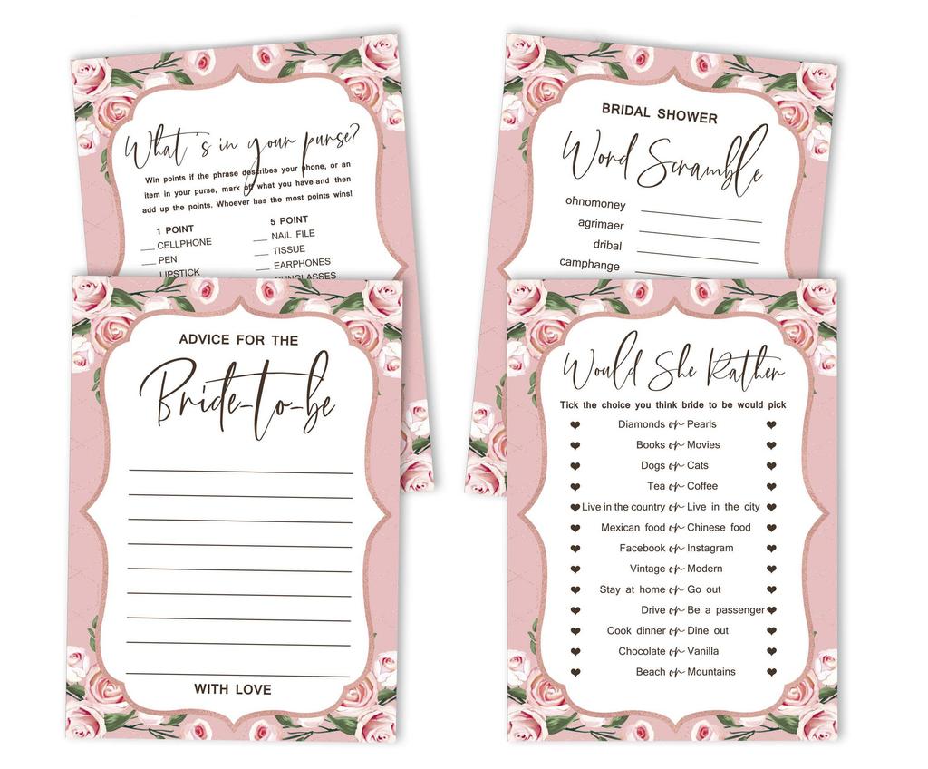 * Set mit 4 Brautparty-Spielen, einschließlich Ratgeberkarten für die Braut, Was ist in Ihrer Handtasche, Worträtsel für die Braut, Würde sie lieber.