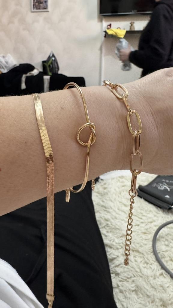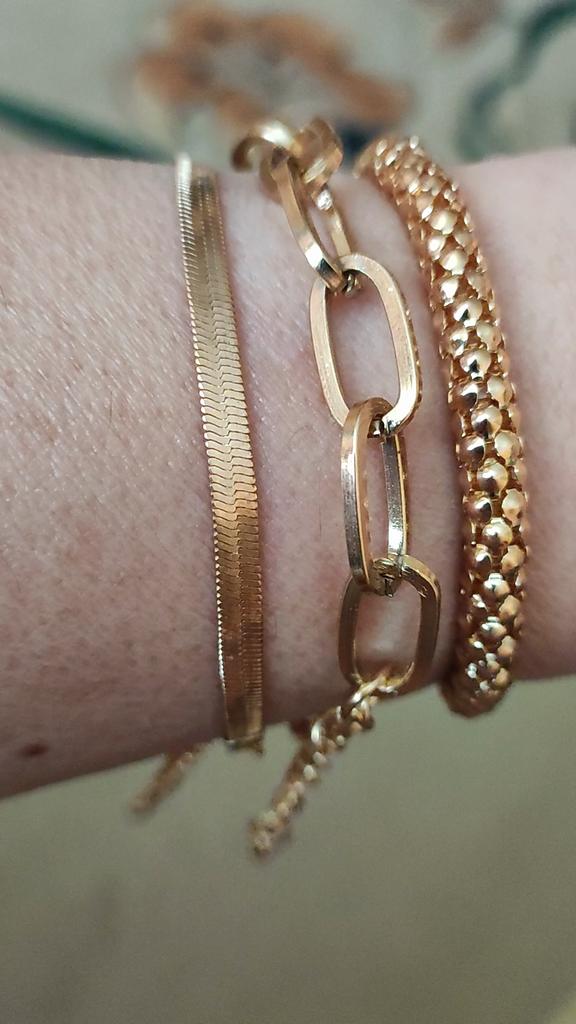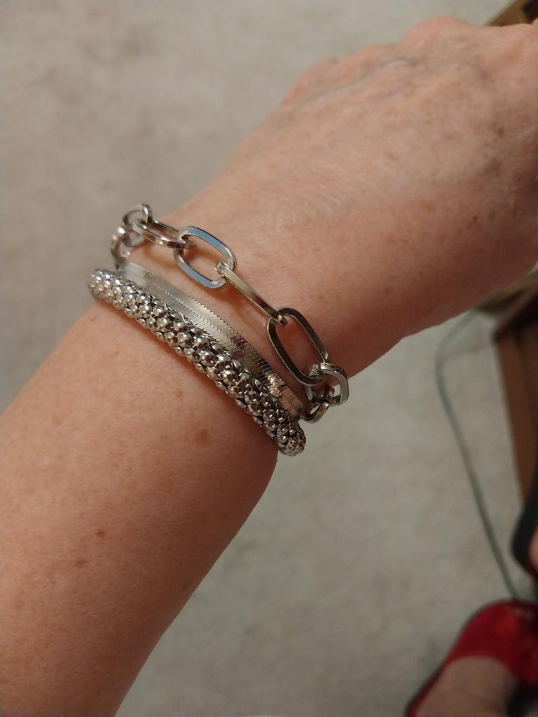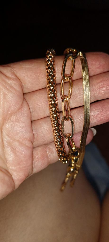 Danke. Das Armband ist gut, oder besser gesagt drei separate: ,,Schlange" - auf Gummizug, flach und große Glieder - mit Verschlüssen. Passend für ein Handgelenk bis 23 cm .