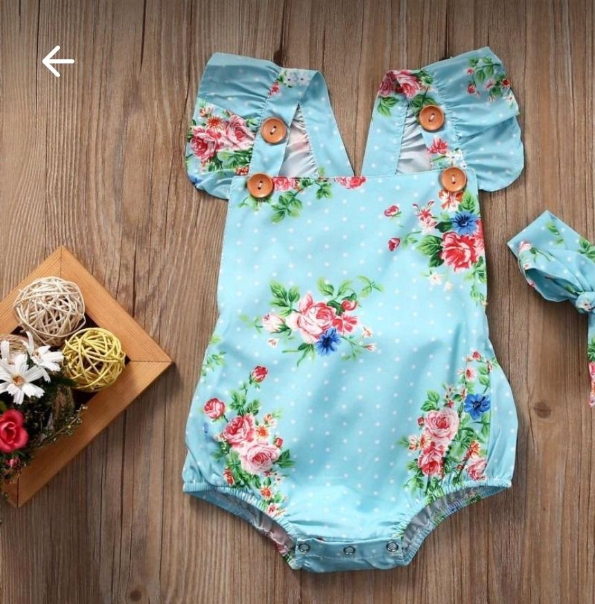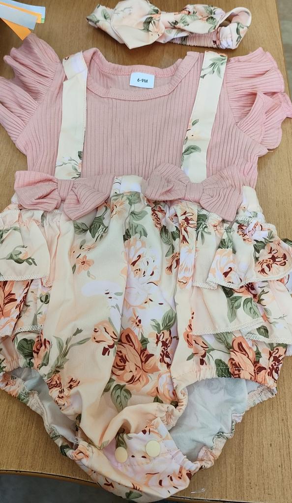 Zweiteiliges Kleidungsset für Babys, Mädchen, rosa Blumenmuster, Strampler mit Fliegenärmeln und Kopfschmuck mit Schleifenknoten, 0–18 Monate