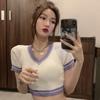 1. Korean version, collision color V-neck slim and skinny with a hundred knitted short-sleeved tops with the exposed navel.
