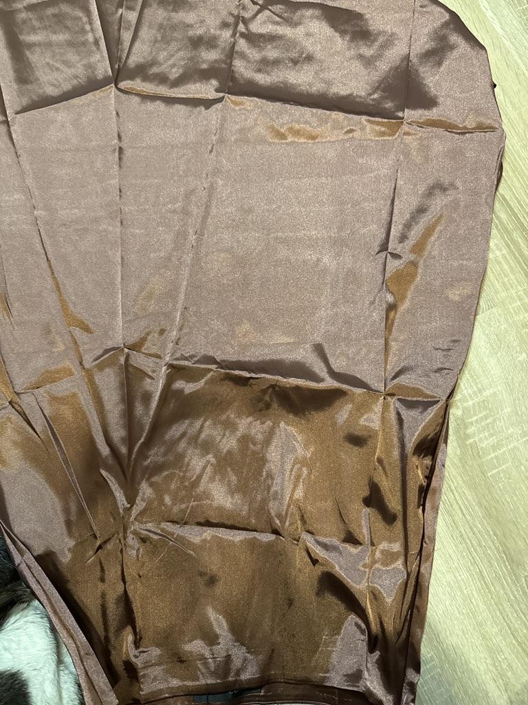 Der Stoff ist Kunstsatin, intensive Farbe, er ist lang, qualitativ genäht, entspricht Größe 54, Hüfte größer als 118 cm, danke.