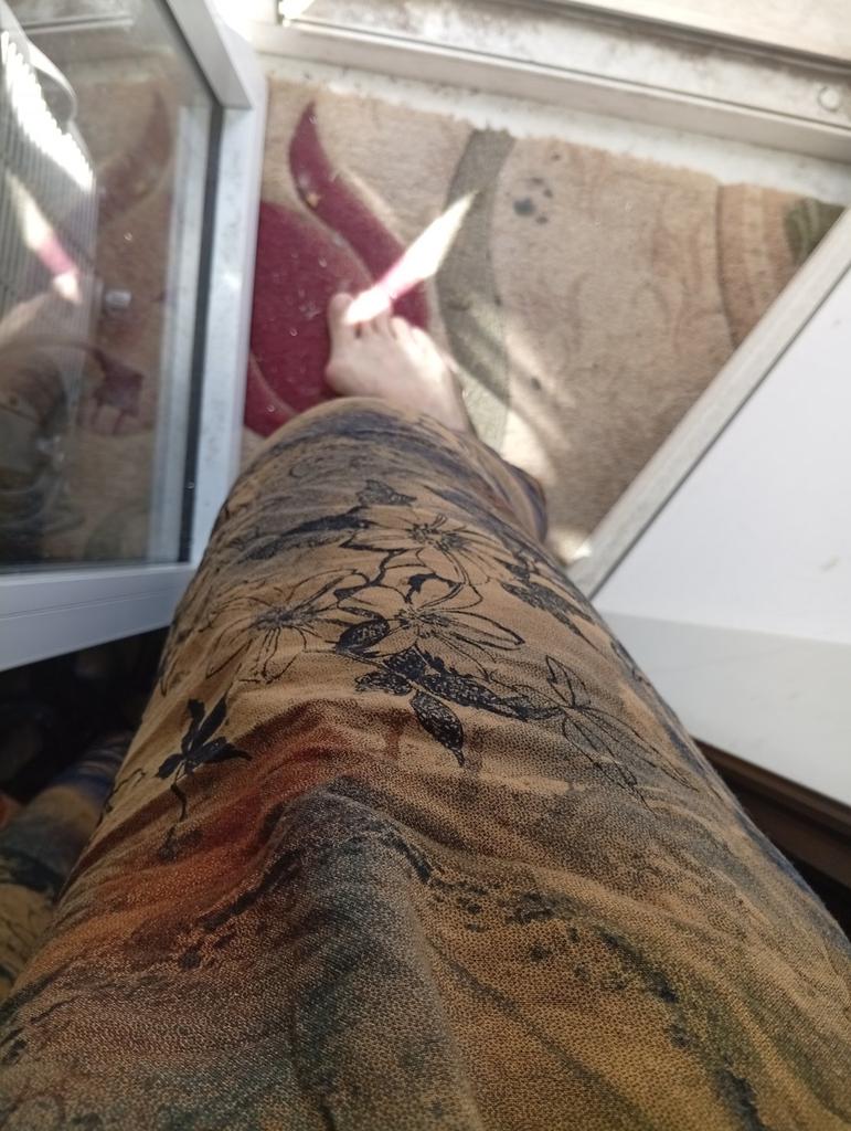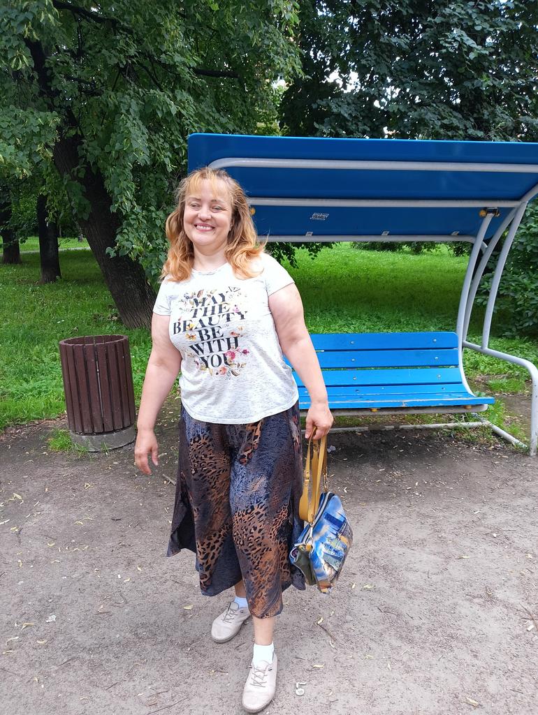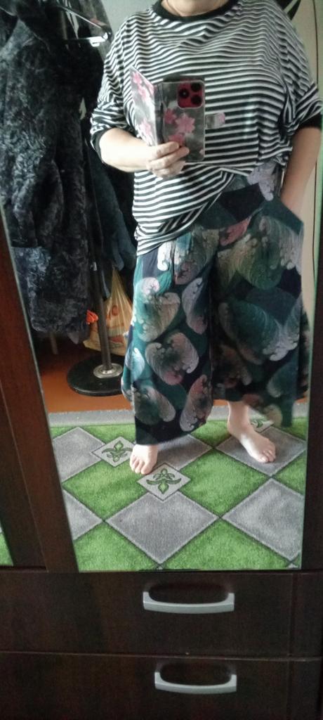 Sehr angenehmer Stoff. Die Größe hat gepasst, ich habe 52 genommen. Der Schnitt ist etwas eigenartig, aber es sieht nicht schlecht aus. Die Taille ist fixiert und lässt sich nicht sehr dehnen, aber meine Hüften haben gepasst. Alles hat gepasst