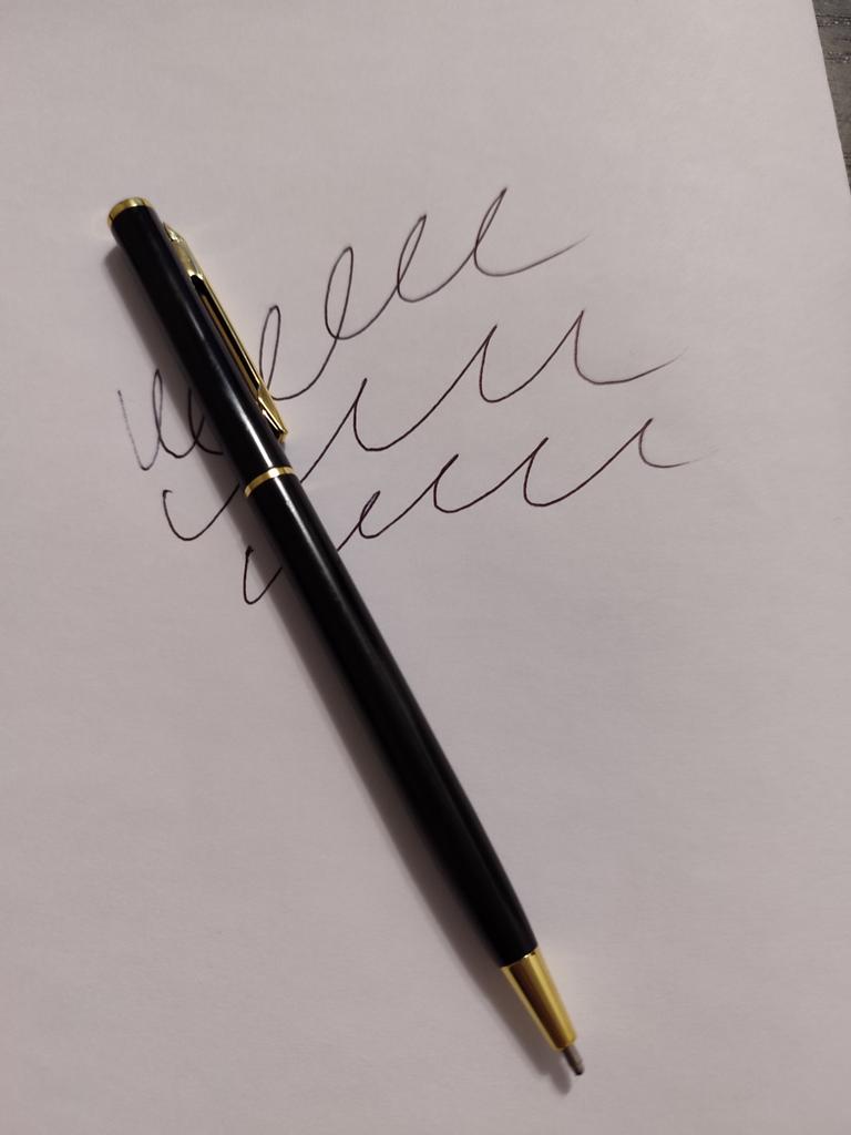Metall, dünn, sehr elegant, schreibt schön und sanft. Der Aufbau ist sehr einfach, die Stange wird durch Drehen verlängert