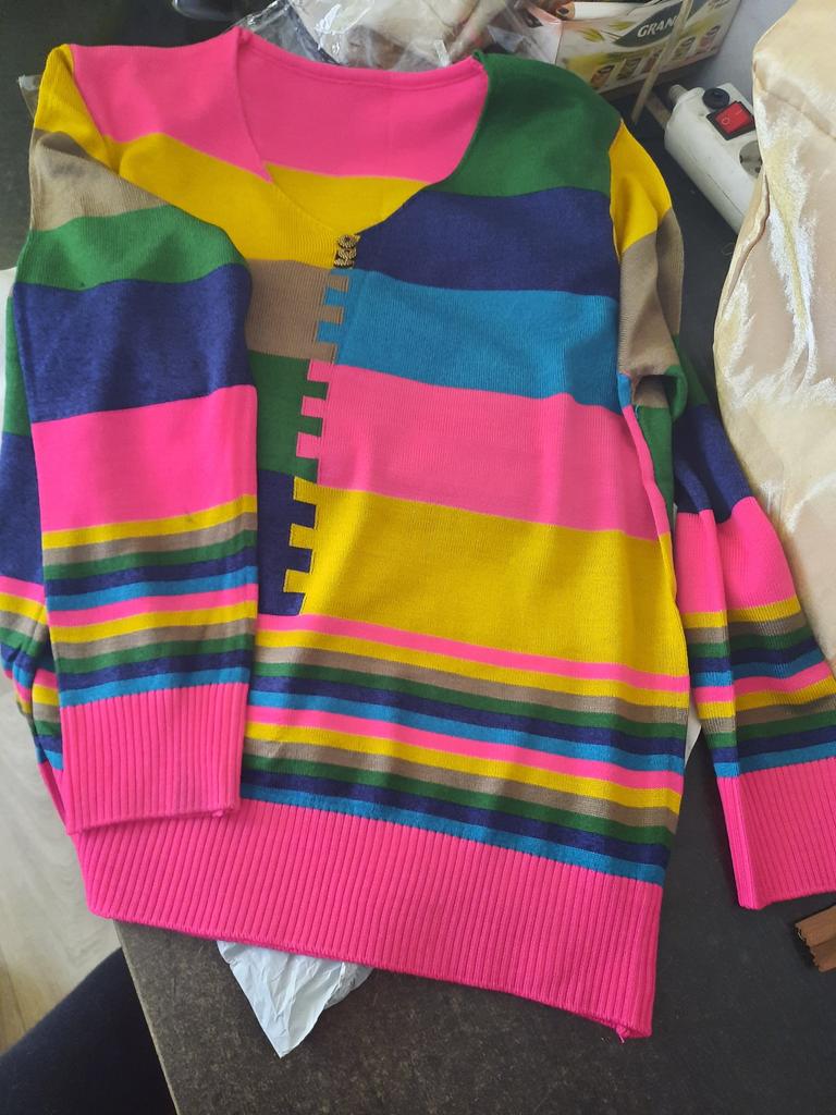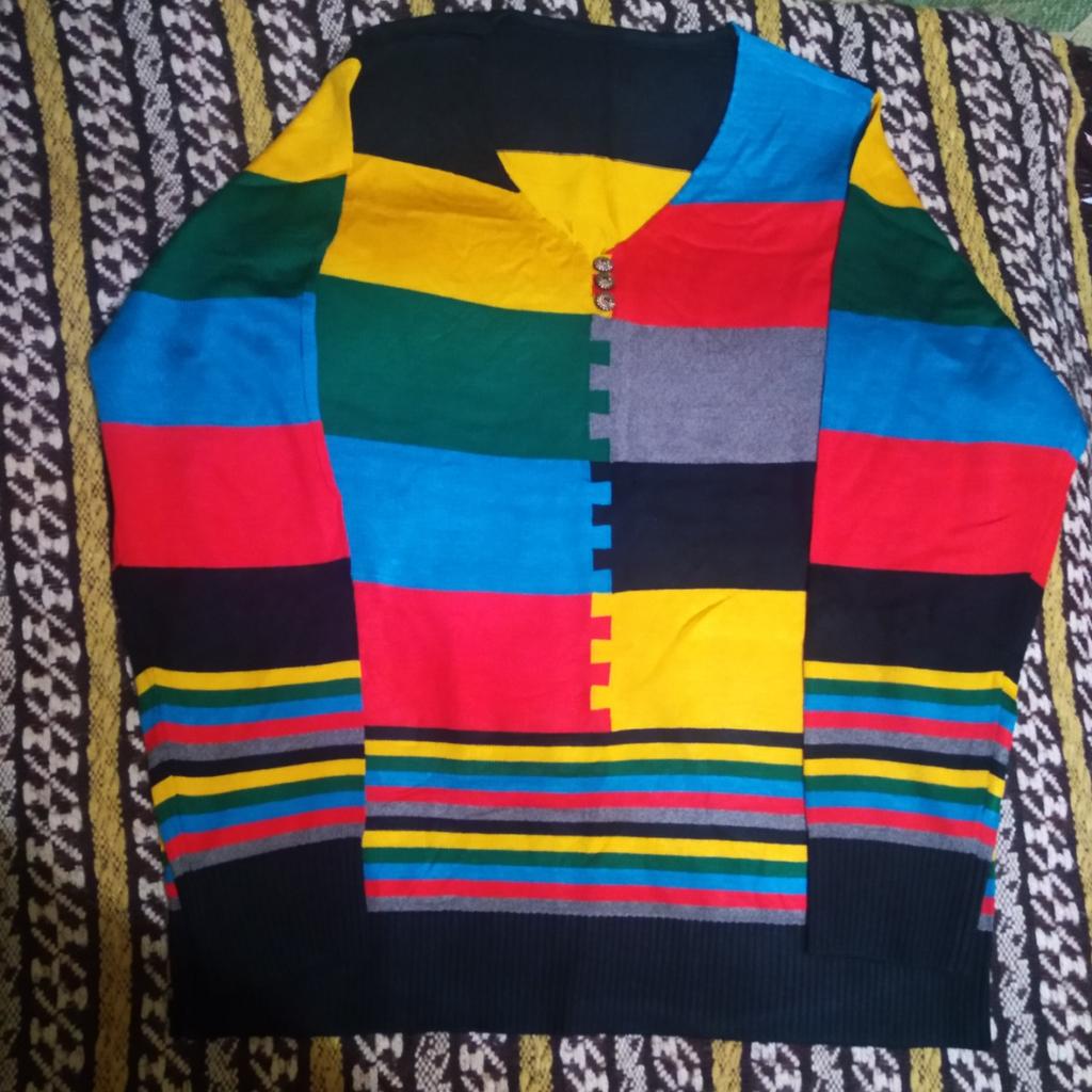 Der Pullover ist leicht und dünn. Sieht gut aus, die Farben sind fröhlich und elegant. Für mich etwas groß.