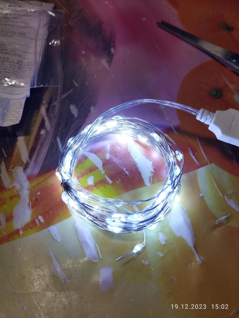 Helle Girlande, die Länge habe ich noch nicht überprüft, aber dem Aussehen nach sind es die angegebenen 10 Meter. Ich habe die Stromversorgung über eine Powerbank getestet - sie leuchtet sowohl im normalen als auch im Schwachstrommodus hell. Vom USB-Stecker ist der Draht mit Silikon isoliert, danach kommt der Draht mit den Dioden, die Dioden sind ebenfalls isoliert. Eine ausgezeichnete Sache!