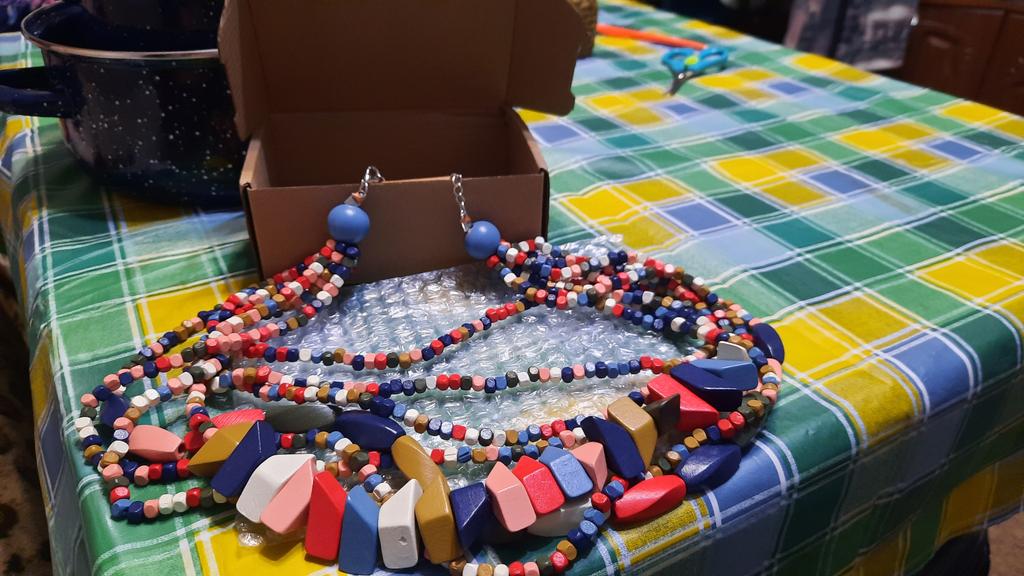 Sehr schöne Perlen und Ohrringe. Aus Holz. Wenn Sie massiven Schmuck mögen, kaufen Sie ihn, Sie werden es nicht bereuen.