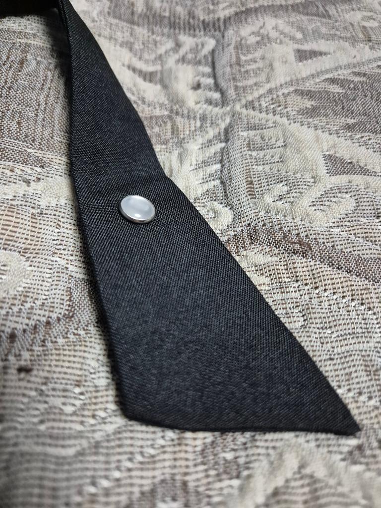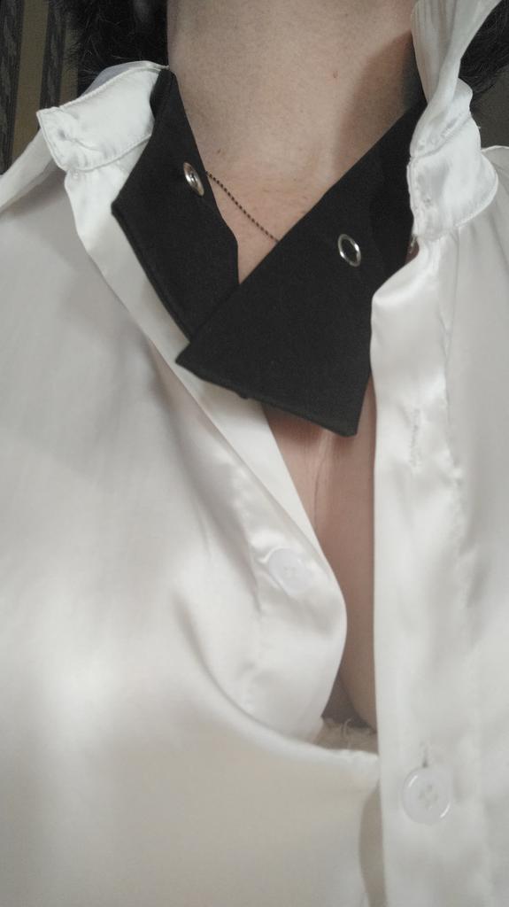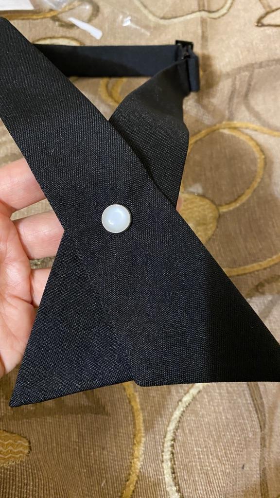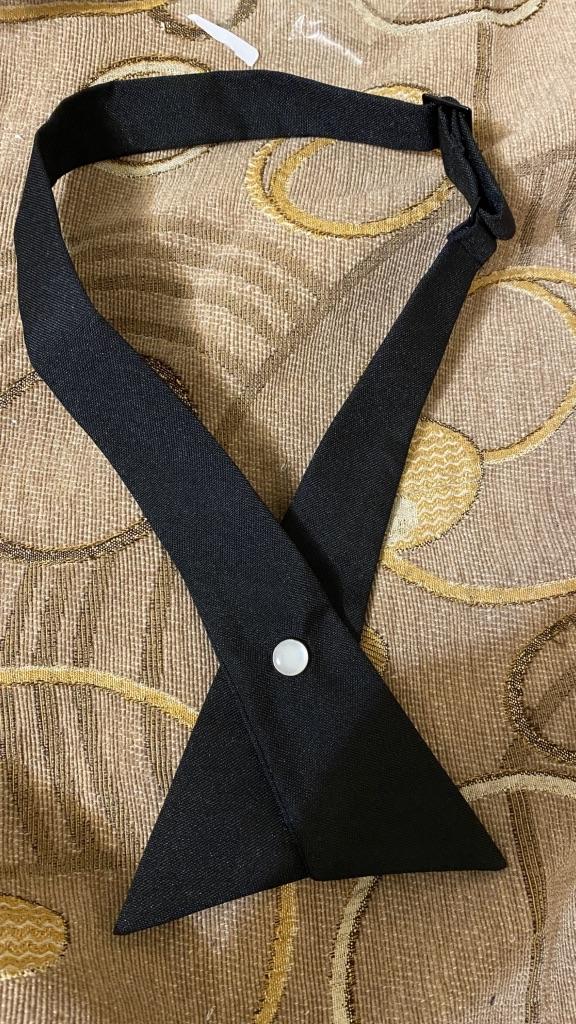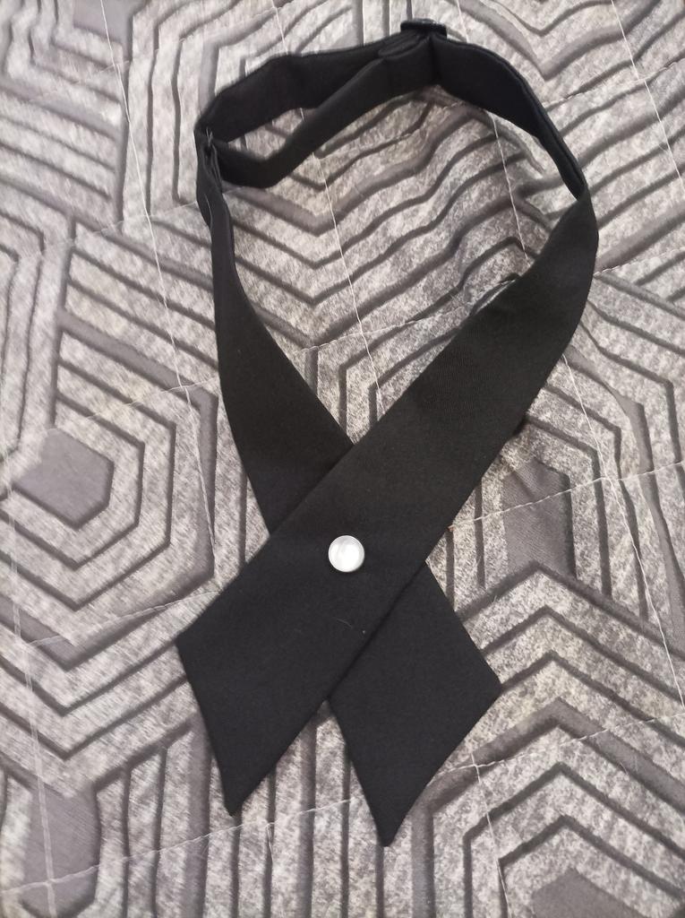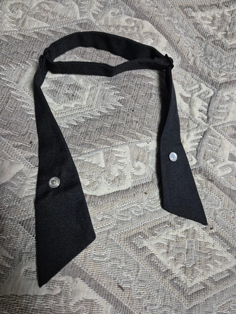 Verstellbare Krawatte, schwarzer Stoff ohne Glanz, Knopf mit Perlmutteinsatz, hält fest. Ordentlich genäht. Kann auf zwei Arten getragen werden. Für ein paar Cent können Sie Ihren Look mit einem ungewöhnlichen Accessoire ergänzen. Großartig!