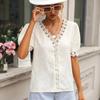 Summer Short Sleeve Tops Jacquard V-neck Lace Women Blouses Casual Hollow Elegant White Shirt Solid Vintage Korean Shirts 25718