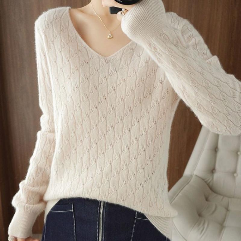 Lockerer, fester Strickpullover mit V-Ausschnitt für Damen, dünn, für Frühling und Herbst, ausgehöhltes, langärmliges Hemd unten, modisches Oberbekleidungsoberteil