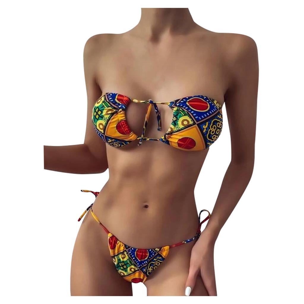 (SU)Damen Sexy Boho-Stil, geometrischer Druck, Bandeau-Badeanzug mit seitlicher Bindung, BIkini, Strandmode