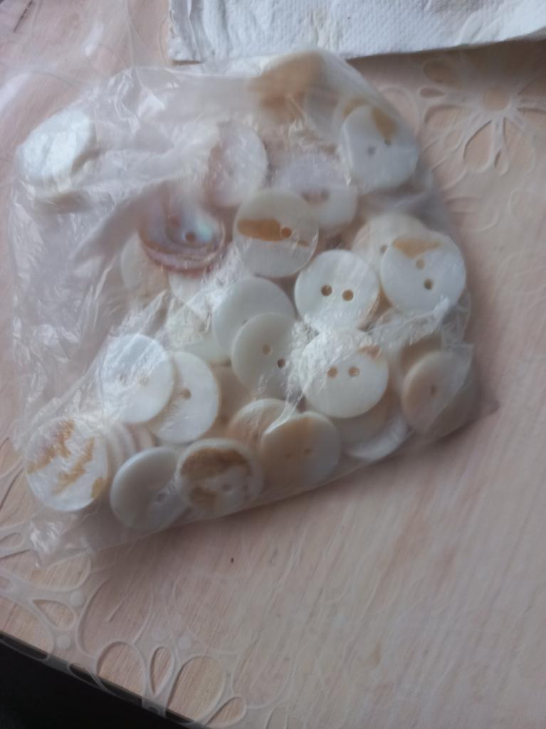 Klein, sehr viele sehr dünne Knöpfe. Eignen sich eher als dekorative. Farbe unterschiedlich: beige und zartblau.