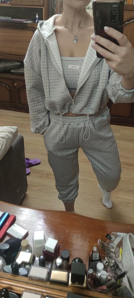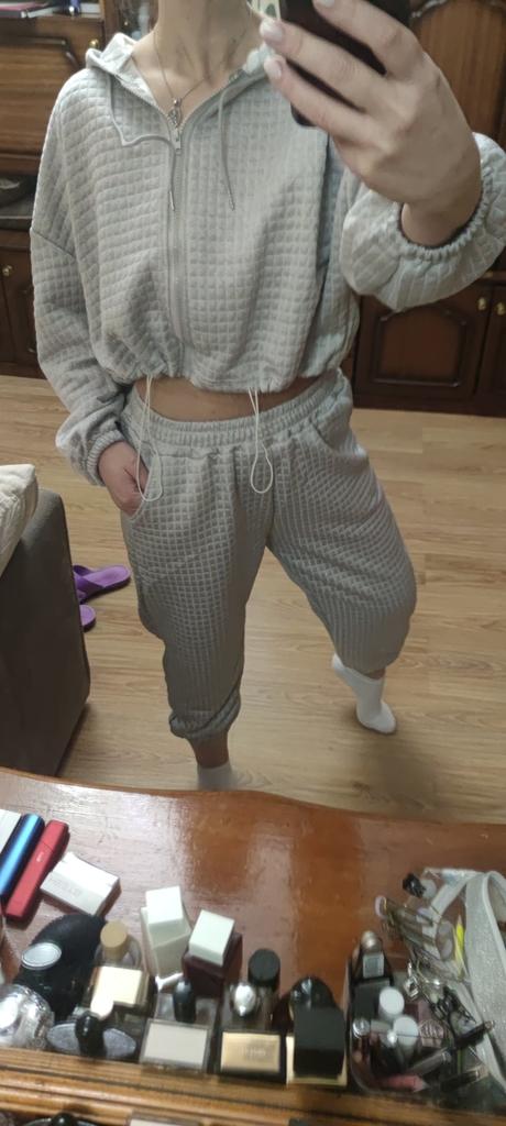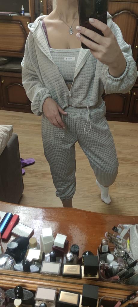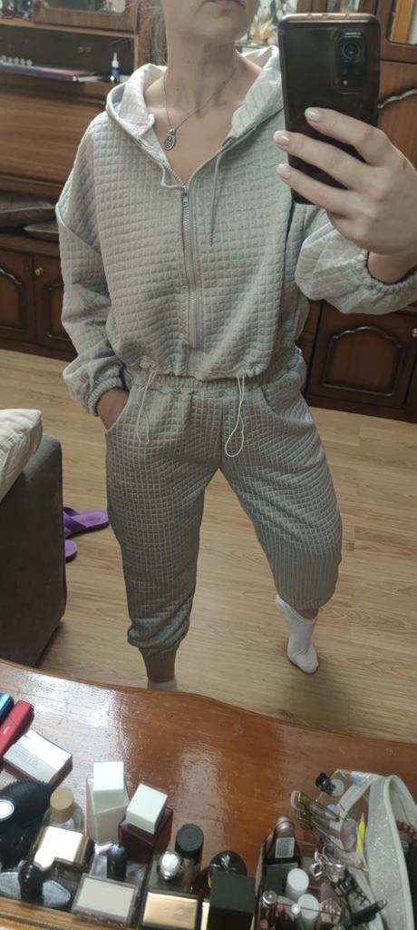 Für meine Größe 46 habe ich eine größere genommen, sie sitzt sehr locker! Mir gefällt es!) Der Stoff ist dicht und weich, das Oberteil ist mir zu groß. Für den Herbst wird es schön sein!