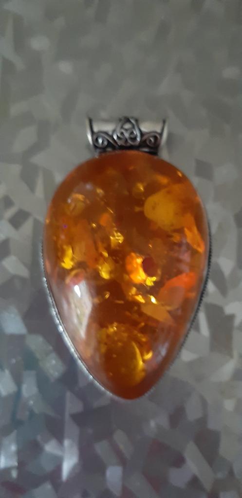 Ein grosser schöner Anhänger. Länge mit Oese 8cm, an der breitesten Stelle 4cm. Der Stein ist jedoch kein echter Bernstein, ist ein sintetic Stein.