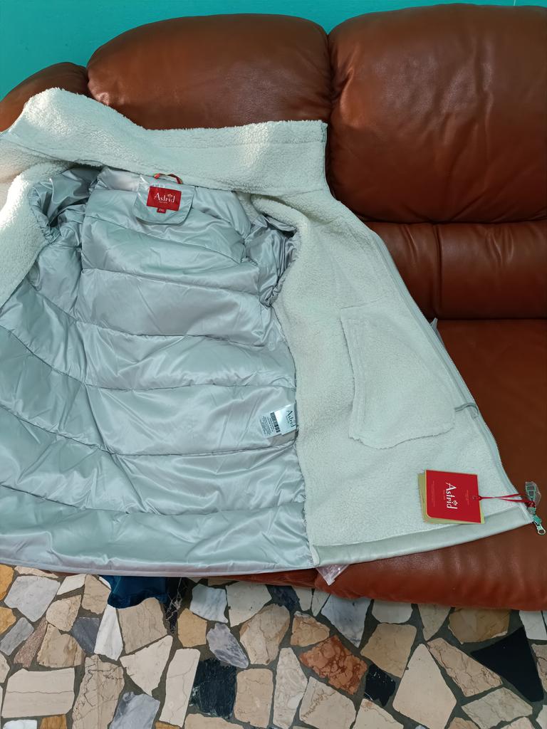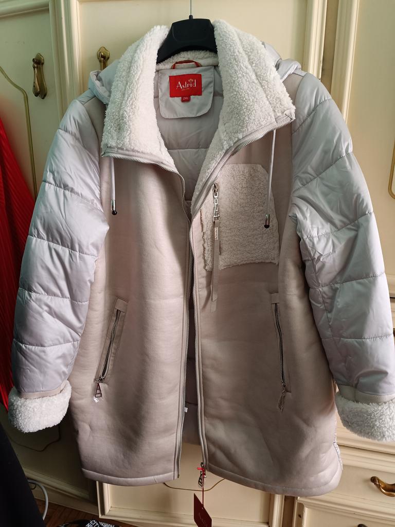 Die Jacke ist gut, warm, bequem, entspricht der Größentabelle, allerdings ist die Farbe auf meinem Foto nicht ganz dieselbe... sie ist in der Mitte beige und die Ärmel und der Kragen sind milchig.