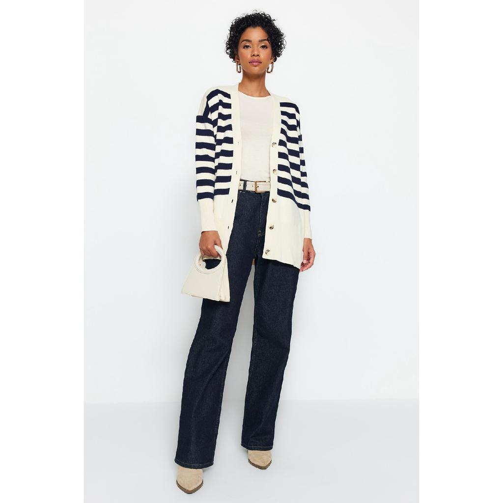 Stein Marineblau V-Ausschnitt Gestreifter Strickwaren-Cardigan Tctaw24th00034
