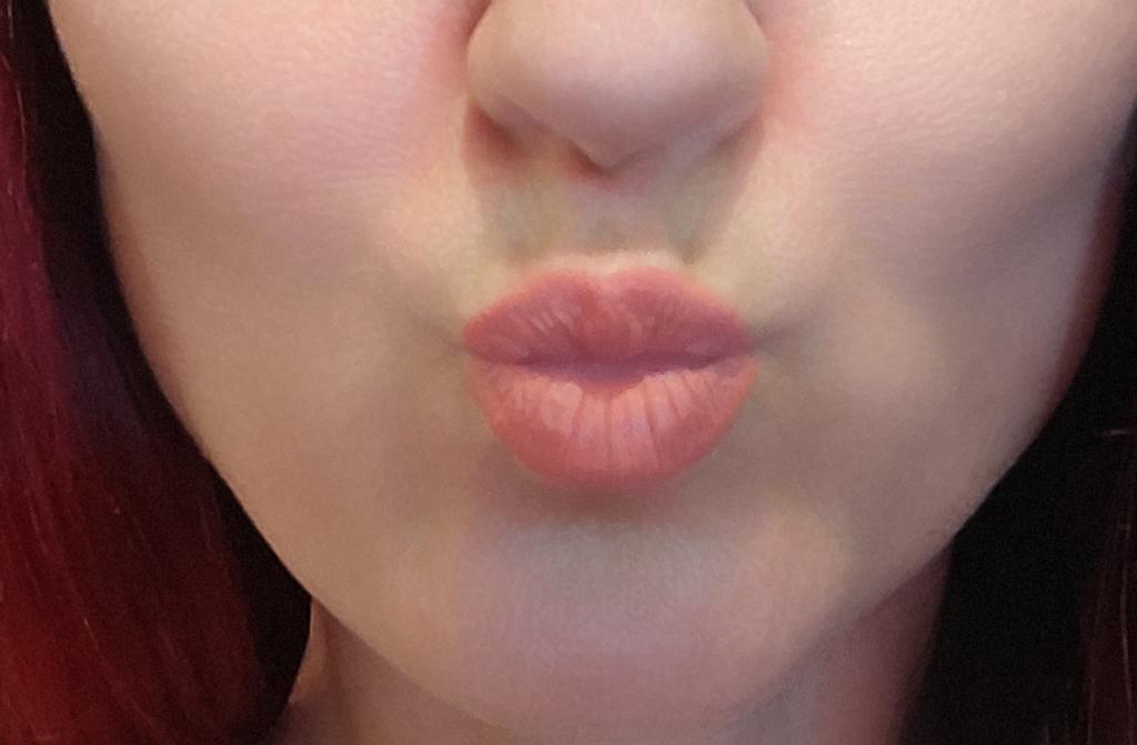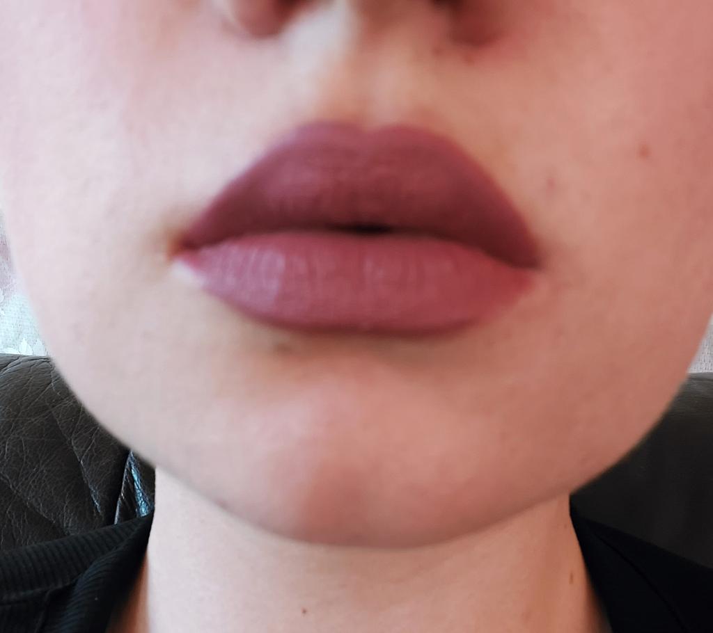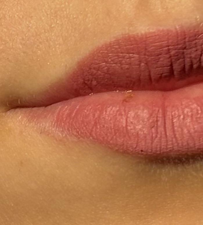 Der Farbton unterscheidet sich geringfügig von dem auf dem Foto. In der Dunkelheit. Sehr trockene Lippen.