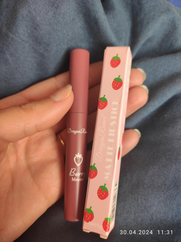 Es ist wasserfest, es ist matt, die Farbe ist wunderschön, es riecht dezent nach Erdbeeren, ich mag alles daran 💄, es ist die Farbe, die ich bestelle, und ich werde auch andere Farben bestellen, es wird über gesammelte Punkte gekauft!