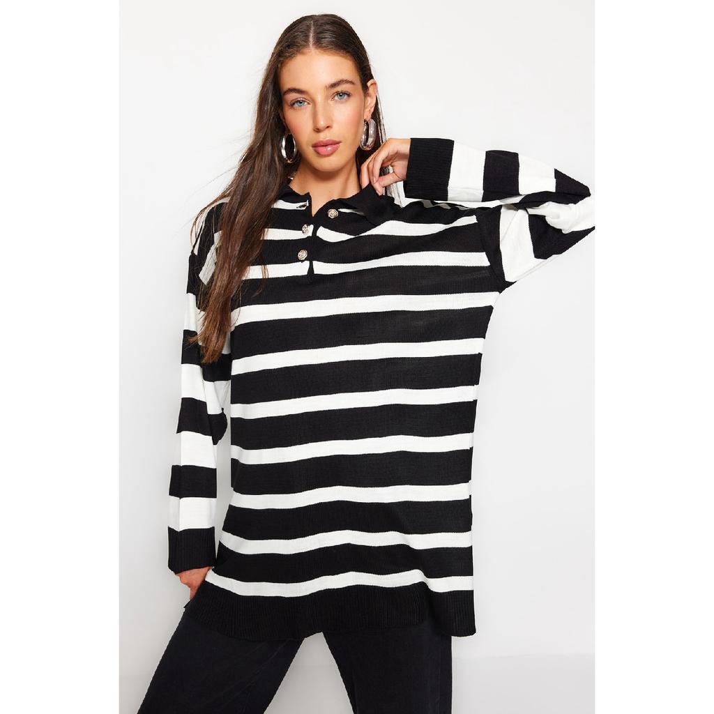 Black And White Polo Neck Striped Knitwear Sweater Tctaw24ak00045