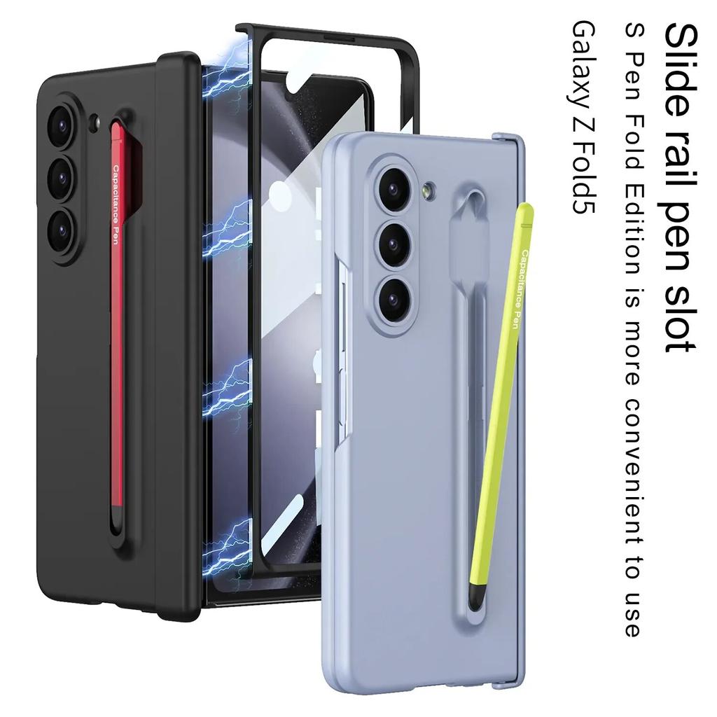Mattes Hautgefühl für Samsung Galaxy Z Fold 5 Hülle, magnetisches Klappscharnier mit buntem Stiftschlitz, gehärtete Folie, stoßfeste Abdeckung