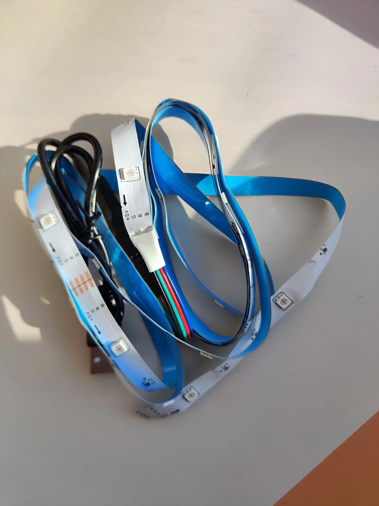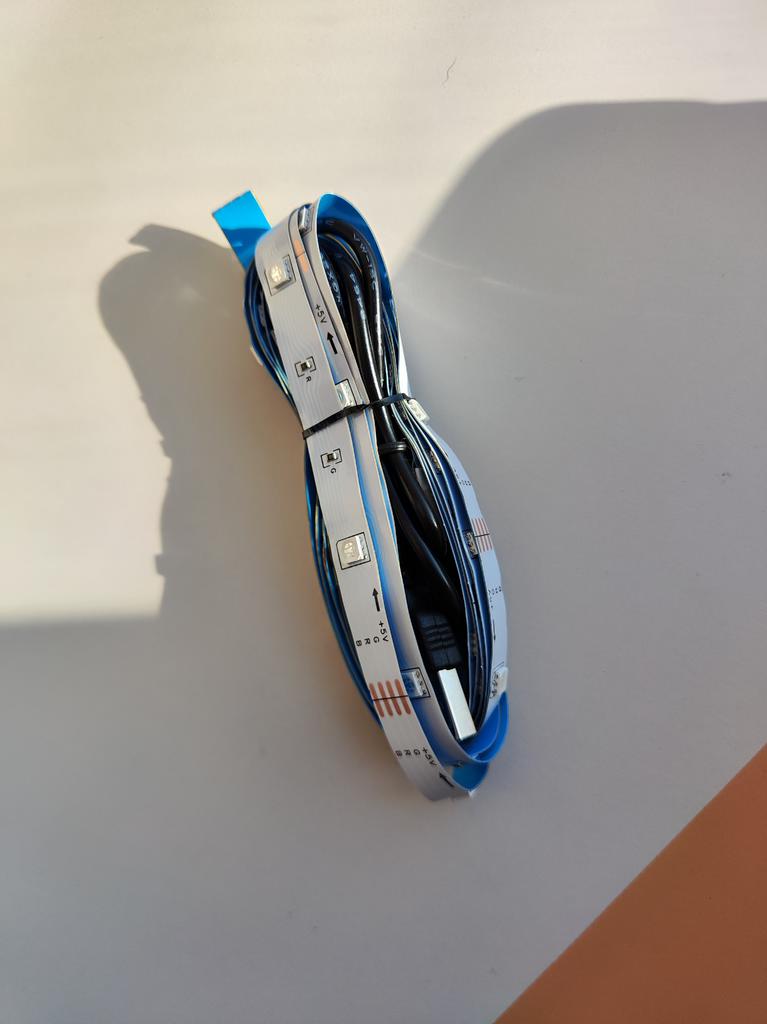 Es gab 36 LEDs, die über 2 miteinander verbundene 1-m-Streifen verteilt waren (kaufte die 2-m-Variante). Im Paket war keine Fernbedienung enthalten (nur der LED-Streifen mit USB-Adapter, der an den Controller angeschlossen ist). Aber es funktioniert. Also ich bin glücklich.
