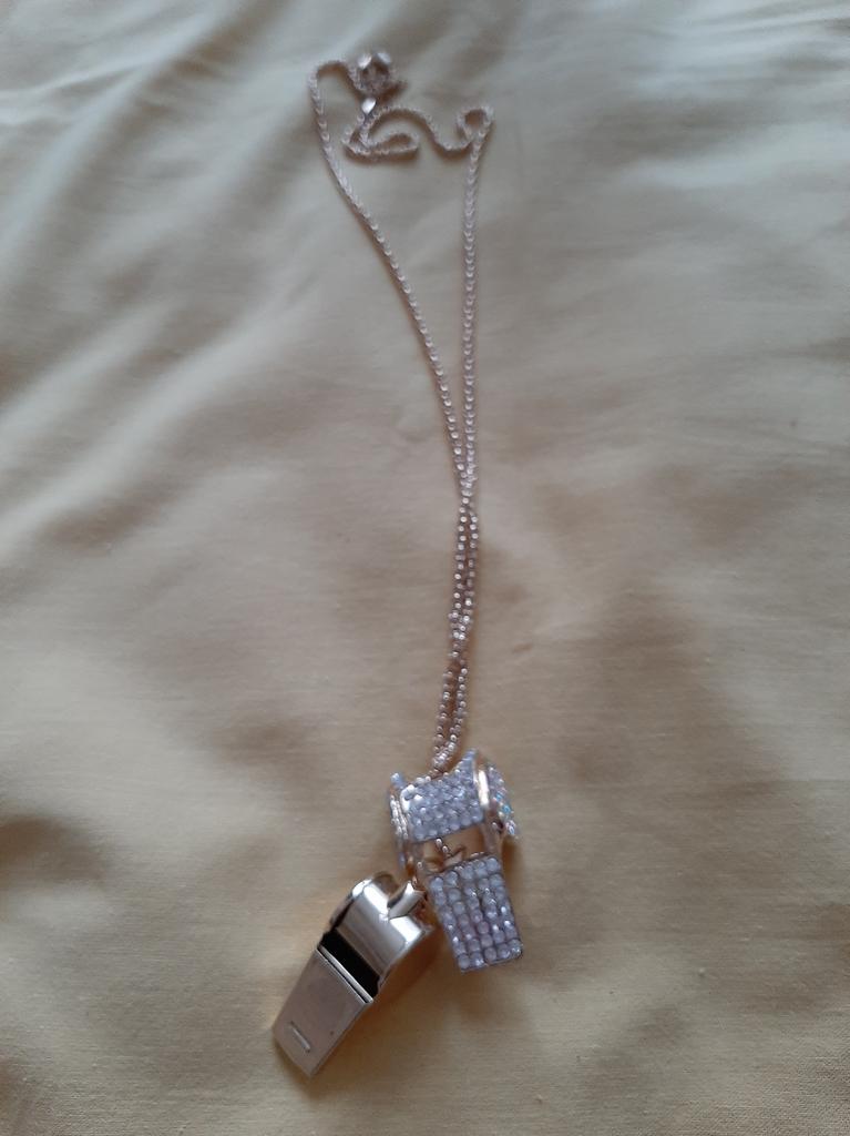 Die Pfeife funktioniert. Die Kette ist lang. Oberhalb der Pfeife befindet sich ein abnehmbares Teil mit Strasssteinen. Ich habe eine Kette mit einem gerissenen Schloss erhalten.