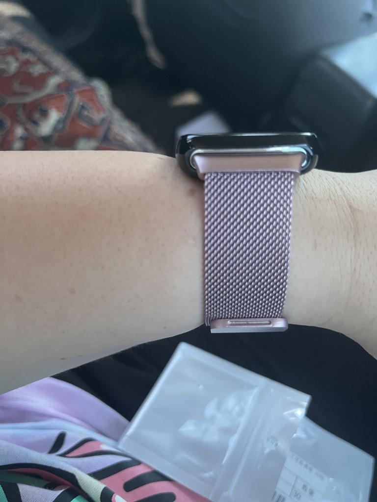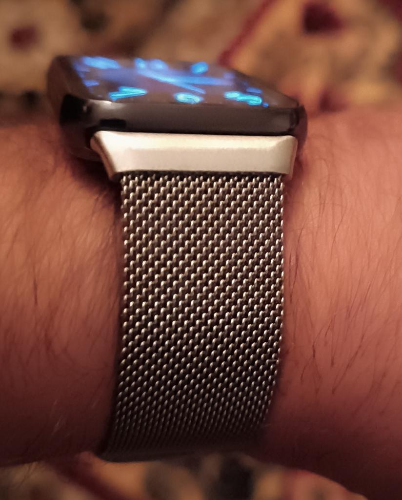 Insgesamt kein schlechter Riemen. Hält fest und sieht an der Hand schön aus. Das einzig Negative ist, dass es dunkel wird 💦 Ich musste sogar mit dem Kontrast spielen, damit man den dunklen Streifen sehen konnte