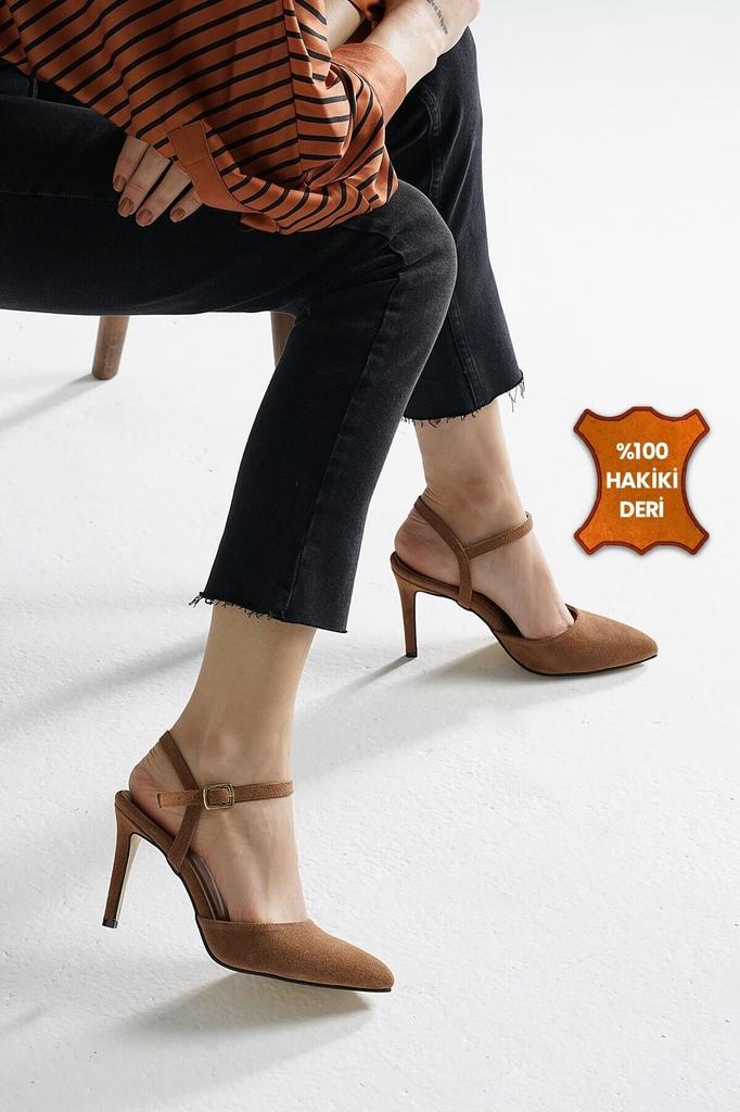 Hellbraune Schuhe mit Absatz aus echtem Wildleder.