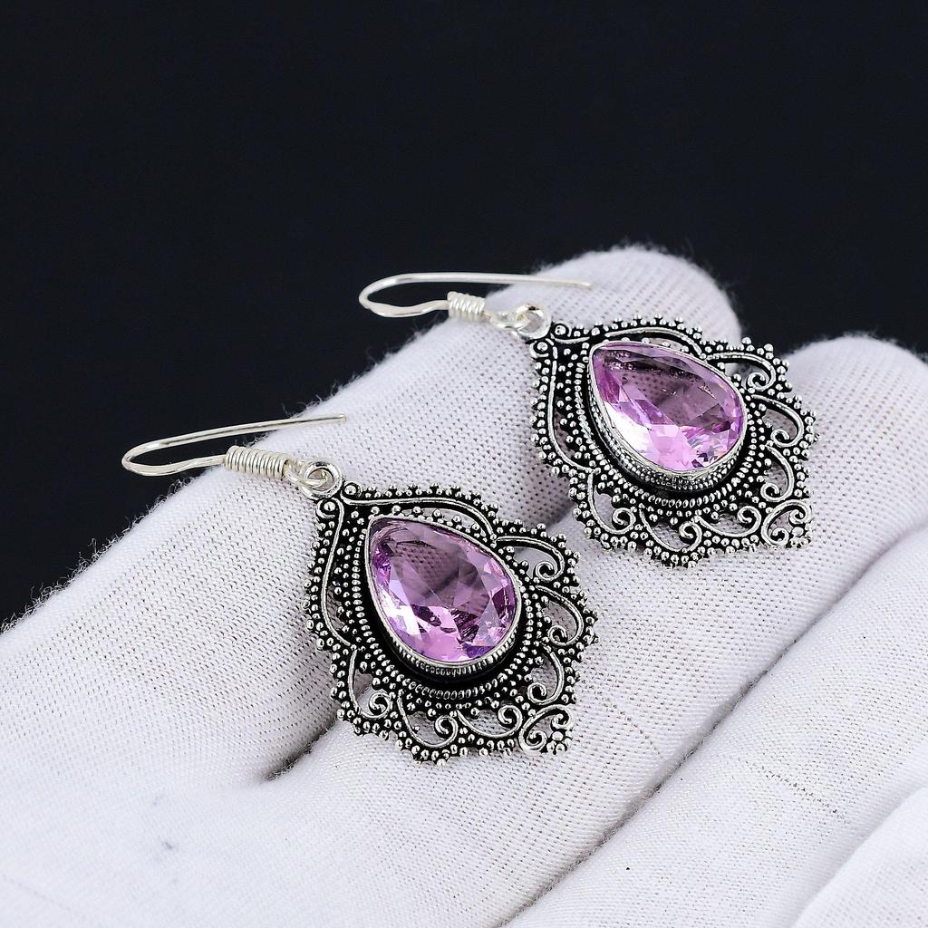 Rosa Kunzit Ohrringe, Edelstein Ohrring, Antik Rosa Kunzit Edelstein Silber Ohrring, 925 Massiv Silber Edelstein Schmuck, Edelstein Ohrring für Sie