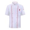 Der waschbare Kochmantel verfügt über einen Stehkragen, kurze Ärmel, Zierbesatz, zweireihige Knöpfe sowie Brust- und Taschentaschen zur praktischen Aufbewahrung.