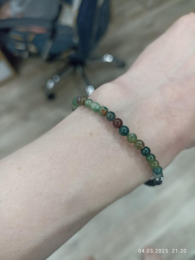 Mein Lieblingsmoosachat in Kombination mit schwarzen Perlen (ich kenne den Namen nicht). Trennt moosige Achatperlen und schwarze Hämatitperlen, aber eine runde auf der einen Seite, zwei flache auf der anderen. (?) Genau so ist es auf dem Foto des Verkäufers abgebildet, auf eine solche Nuance habe ich bei der Bestellung nicht geachtet. Vielen Dank an den Verkäufer, Jum und den Lieferservice.