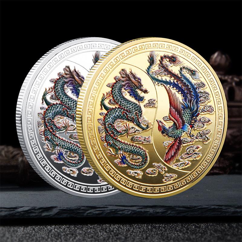Drache und Phönix verheißungsvolle Gedenkmünze, Drachen- und Phönix-Beschichtung mit Gold und Silber, chinesische verheißungsvolle Kultur-Gedenkmedaille als Geschenk