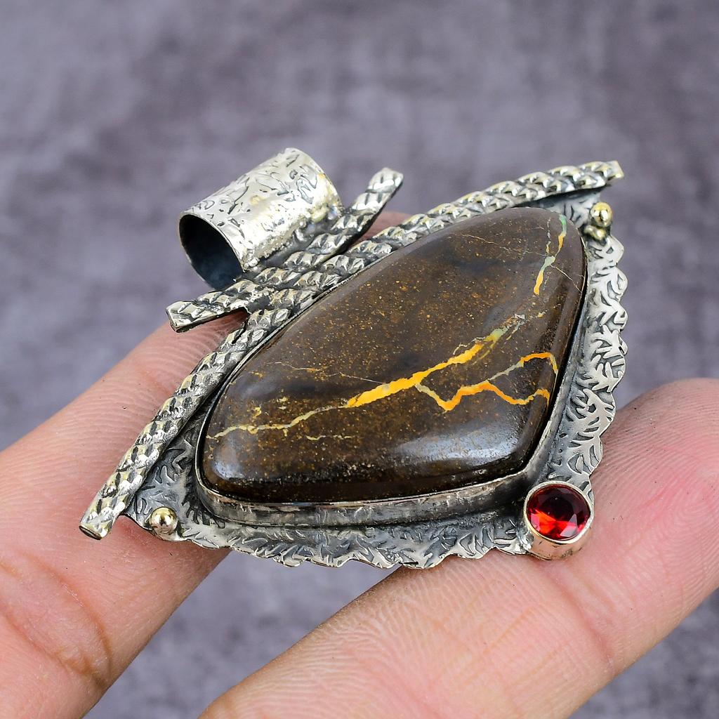 Natürlicher Boulder-Opal, Granat, handgefertigter Anhänger aus 925er Sterlingsilber, 5,5 cm