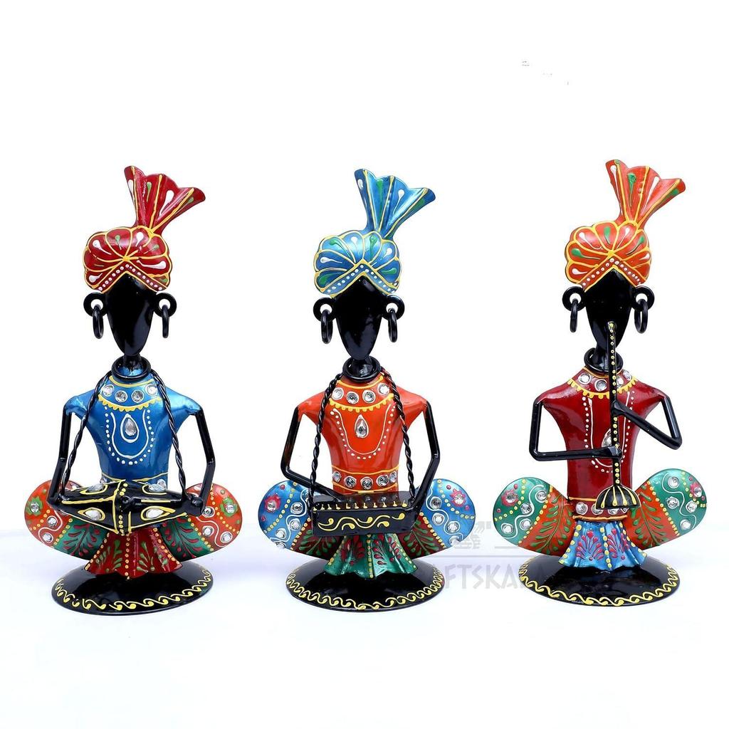 Filigrane rajasthanische Handwerkskunst: Dieses handgefertigte Schmiedeeisen-Schaustück von 3 Stammesmusikern zeigt die filigrane Kunstfertigkeit Rajasthans, bekannt für sein reiches kulturelles Erbe und seine exquisite Handwerkskunst.. Die geschickten Handwerker haben sorgfältig zarte Designs und Muster geschaffen, die die Essenz der rajasthanischen Kunst einfangen und dem Stück einen Hauch von Eleganz verleihen.. Die Liebe zum Detail und die künstlerische Finesse machen dieses Prachtstück zu einem wahren Augenschmaus.