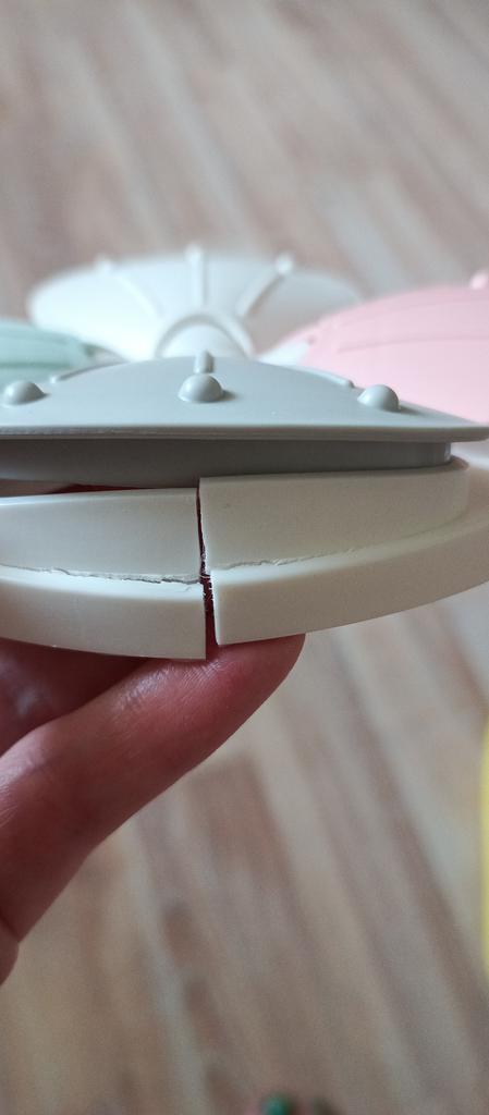 Der Deckel ist an der Naht gerissen. Er muss aus einem elastischeren Material gegossen werden.
